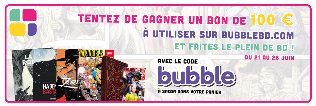 Du 21 au 28 Juin, passez commande sur la boutique en ligne et renseignez le code "BUBBLE" dans votre panier pour tenter de gagner 1 bon de 100 € à valoir sur tout le catalogue de BubbleBD : Bd, Comics, Manga, Livres Jeunesse... faites vous plaisir !