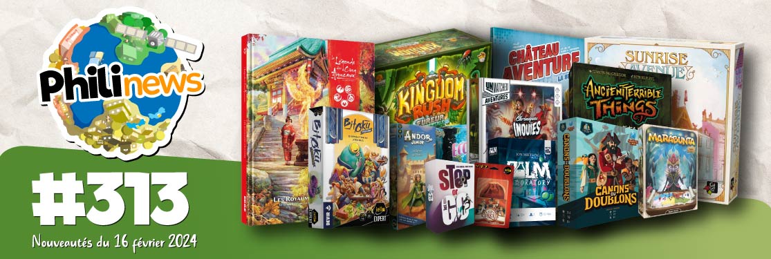 Dans la Philinews 313, découvrez les nouveautés Unmatched Aventures - Chroniques Inouïes de Iello, Sunrise Avenue de Gigamic, Marabunta de S...