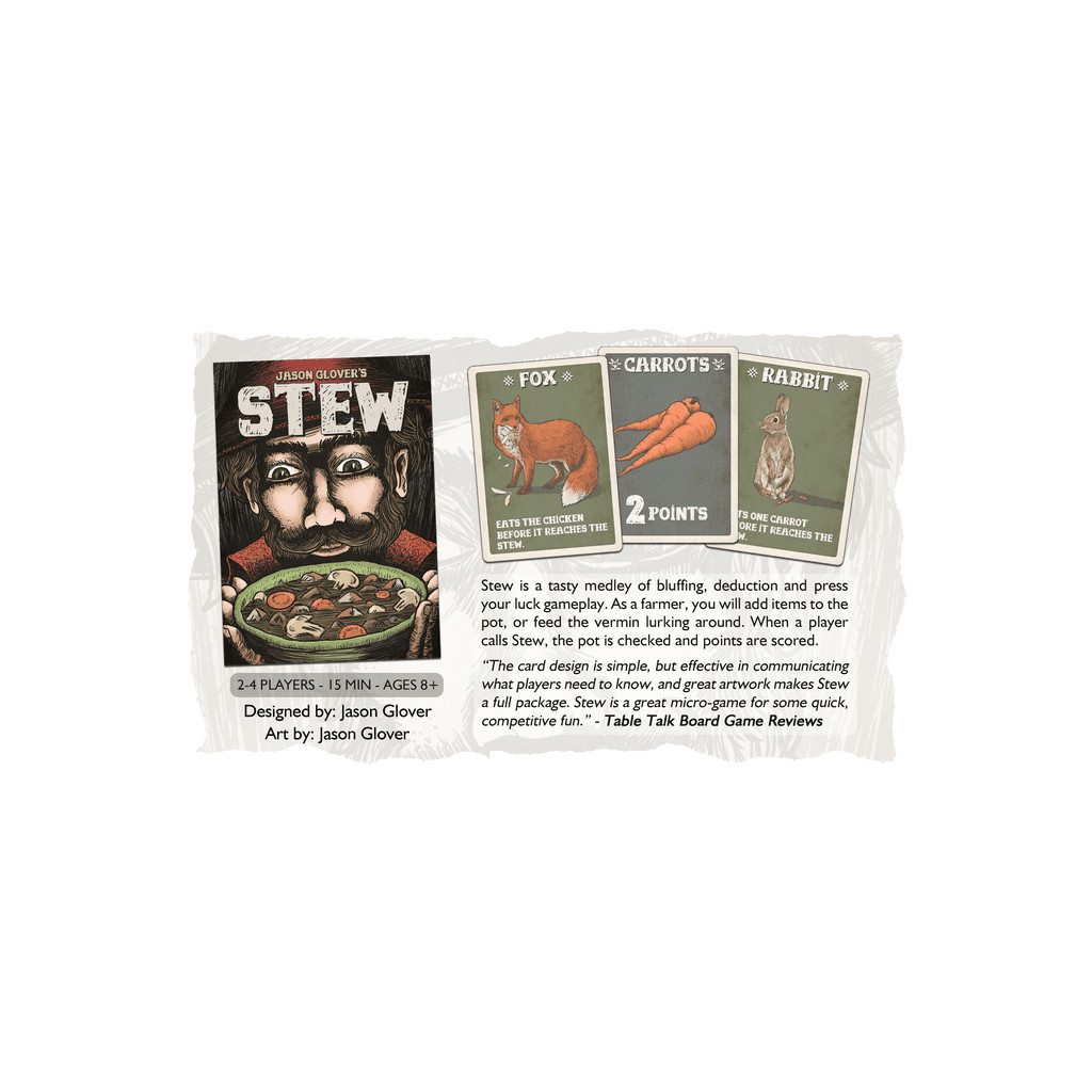 Stew est un jeu de prise de risque. Vous et les autres joueurs incarnez des fermiers qui récoltent des ingrédients du jardin pour préparer un ragoût. Mais attention : six nuisibles rôdent et veulent manger votre ragoût avant vous !