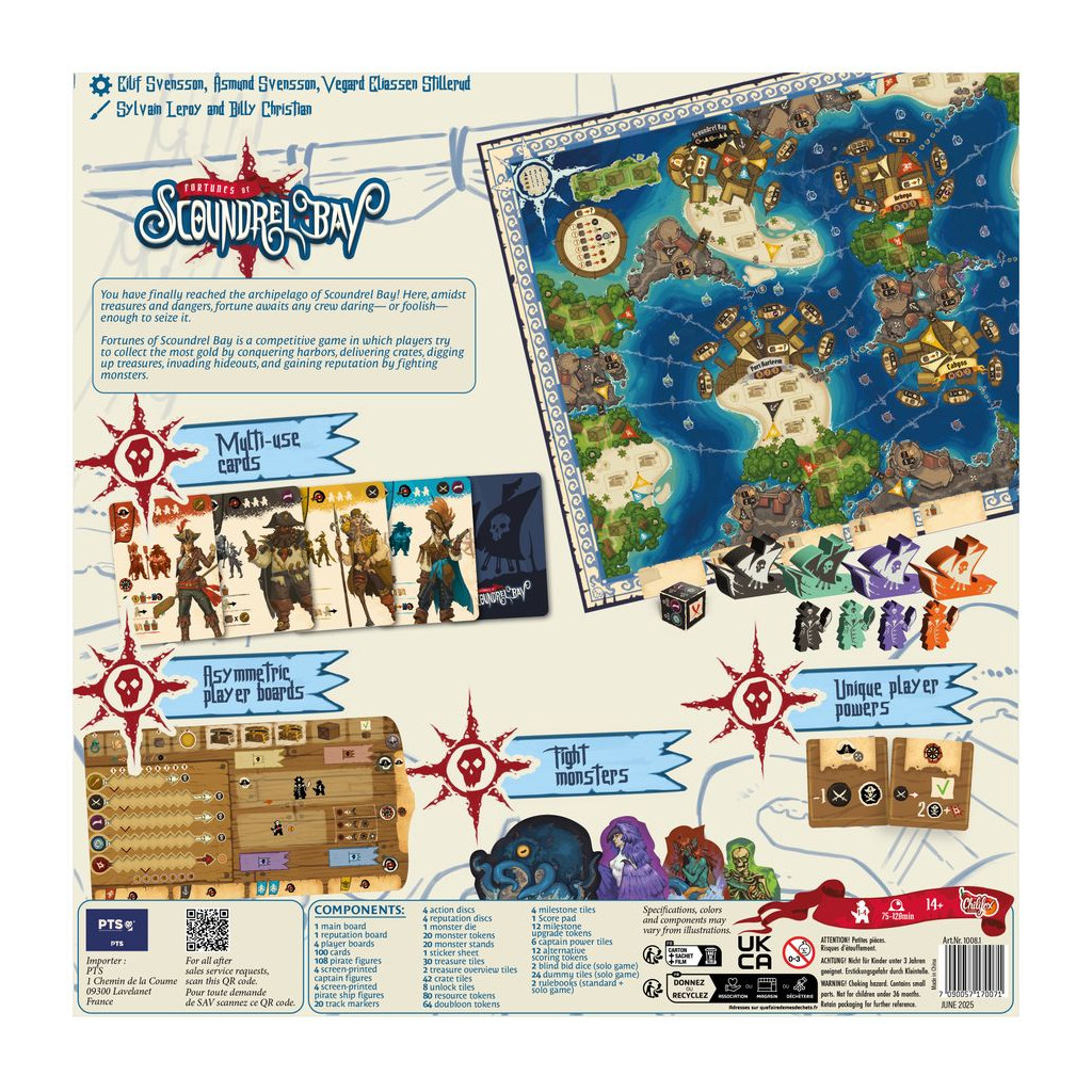 Fortunes of Scoundrel Bay est un jeu à forte interaction dans lequel les joueurs se disputent les majorités des zones sur des îles lucratives, devancent leurs rivaux dans un recrutement ouvert de membres d'équipage, font la course pour affronter les monstres et déjouent les autres capitaines dans des enchères cachées tendues — tout cela sans recourir à des mécaniques négatives.