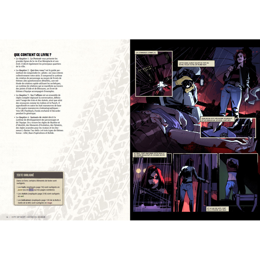 Ce livre contient tout ce dont un joueur de City of Mist a besoin : une présentation de l’univers du jeu, les outils pour créer et faire évoluer son personnage, ainsi que les règles complètes.