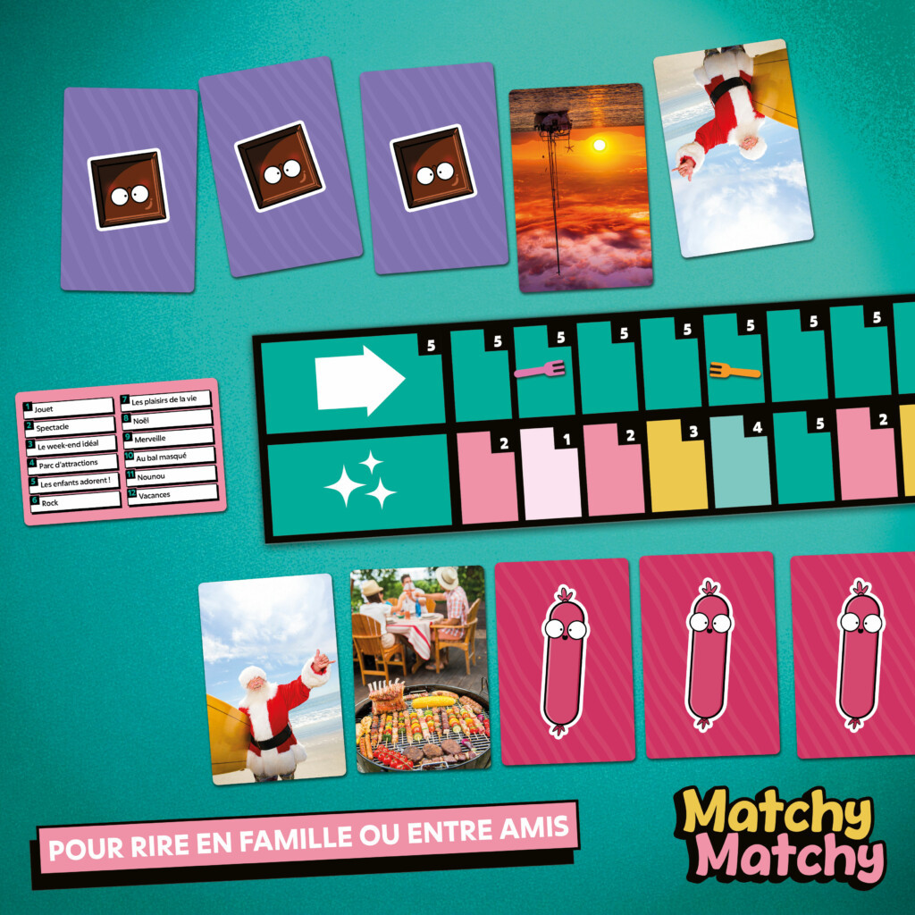 Matchy Matchy est un jeu d’ambiance délirant où votre mission est simple : choisir les mêmes images que votre équipier pour prouver à quel point vous êtes sur la même longueur d’onde !