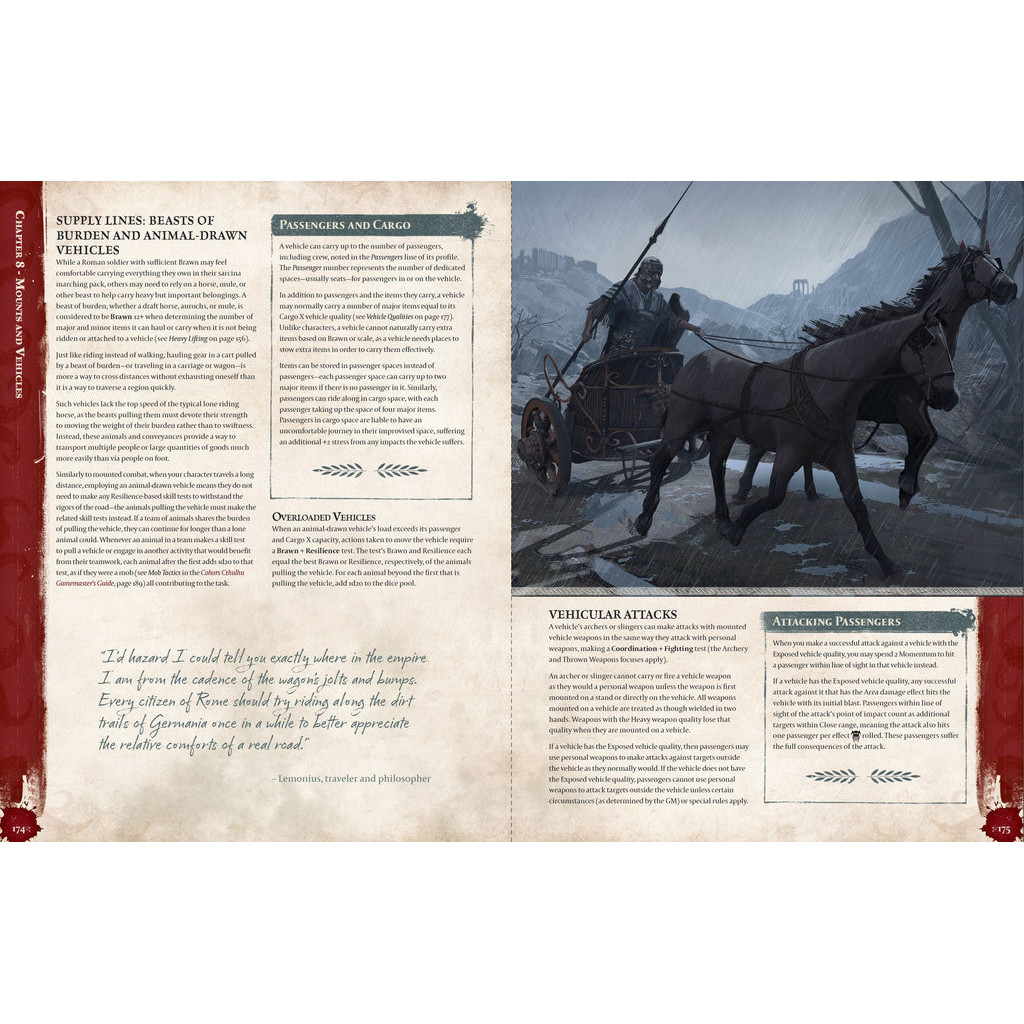 Entrez dans un monde peuplé de légionnaires romains intrépides, de guerriers germaniques, gaulois et celtes courageux, de stratèges rusés venus de Grèce et de Bretagne, ainsi que d’archers et de mystiques valeureux originaires de contrées comme la Parthie, l’Égypte et l’île d’Hibernia. Incarnez ces héros et forgez des alliances improbables avec d’anciens ennemis pour affronter le Culte de Mormo, les sbires de Nyarlathotep et Yog-Sothoth, ainsi que d’autres cabales perfides. Les Mi-Go grouillent voracement dans les tunnels des mines perdues, tandis que les Profonds rôdent sous les vagues en quête de sacrifices.