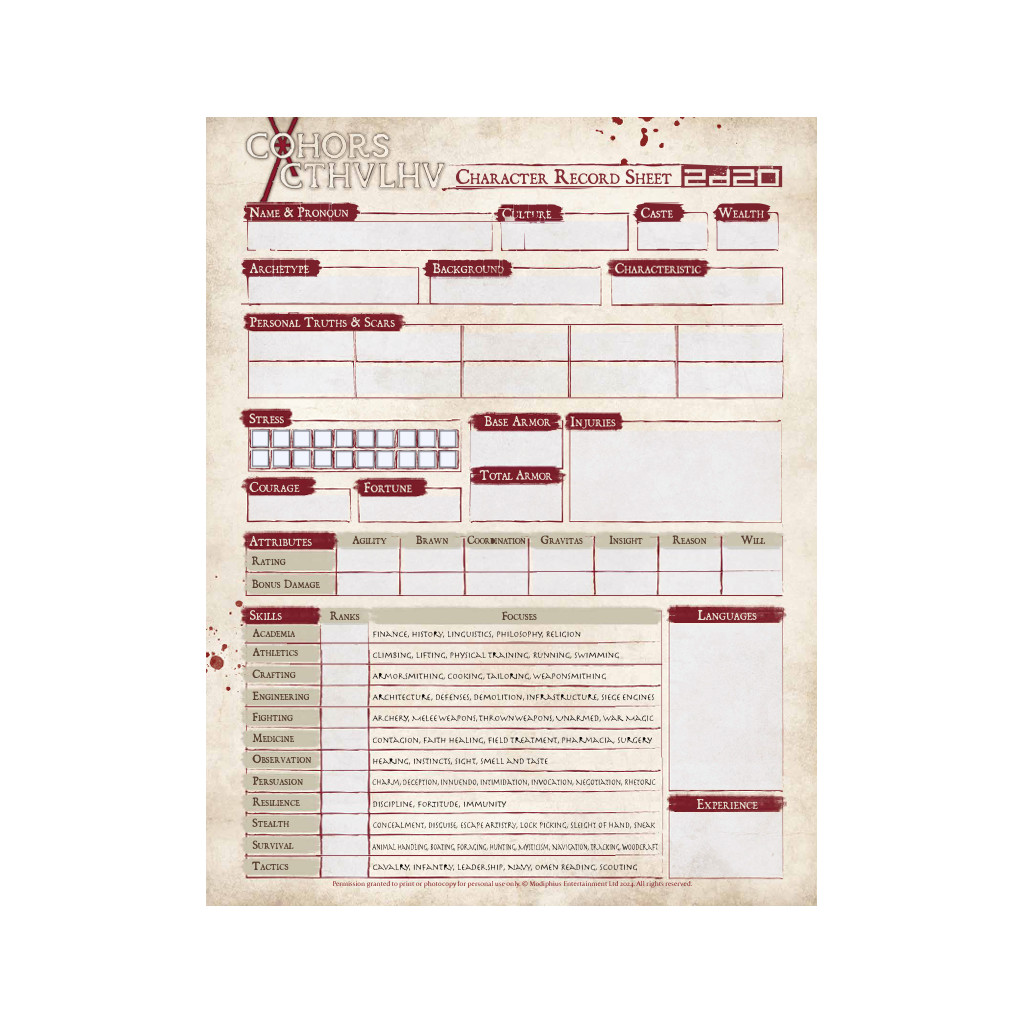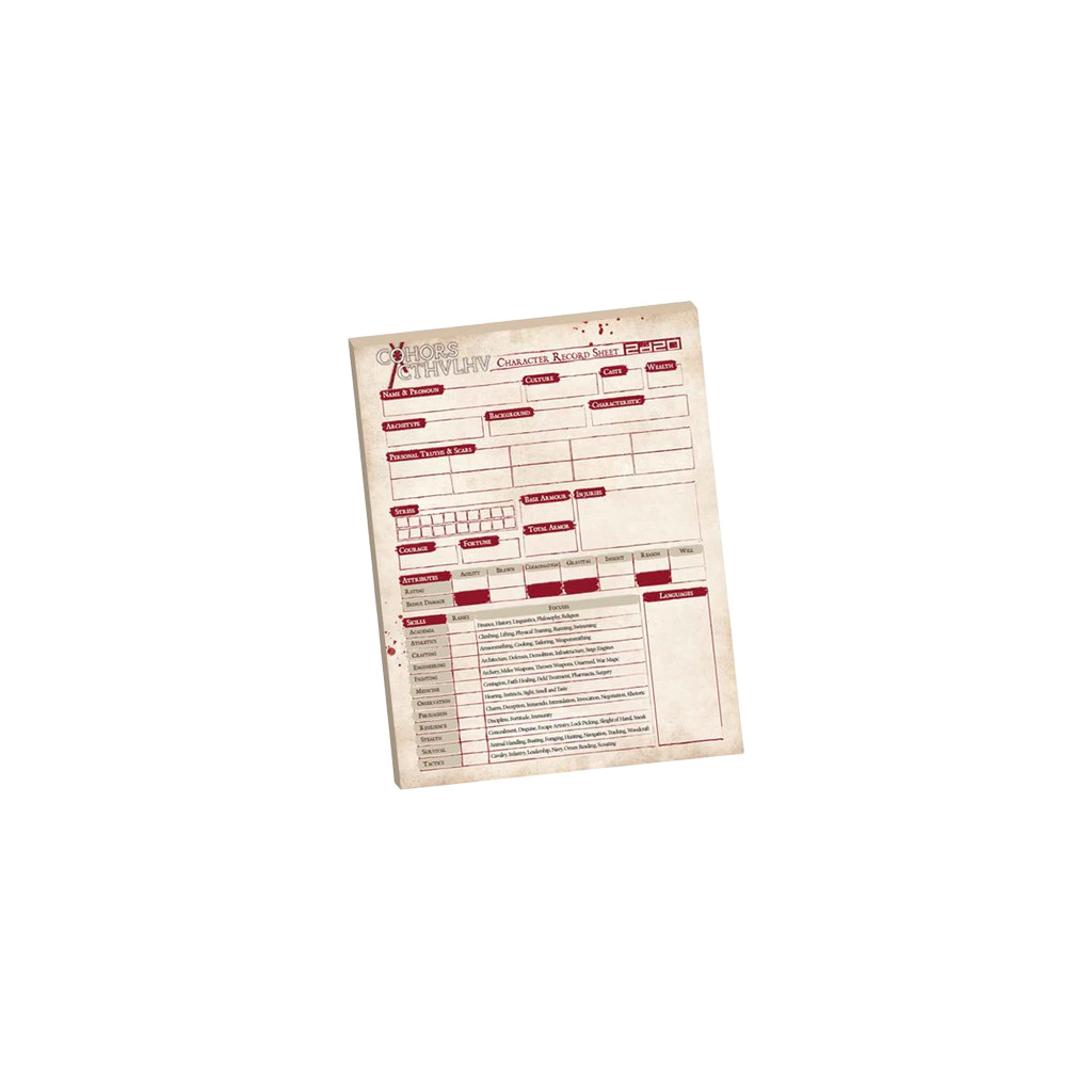 Ce bloc de fiches de personnage comprend 25 fiches en couleur, recto-verso, sur deux pages, spécialement conçues pour le jeu de rôle Cohors Cthulhu 2d20.