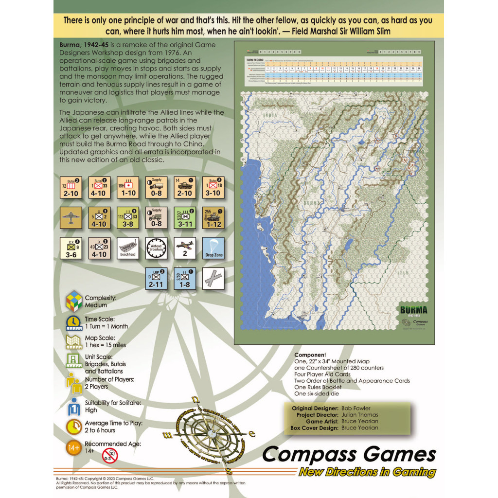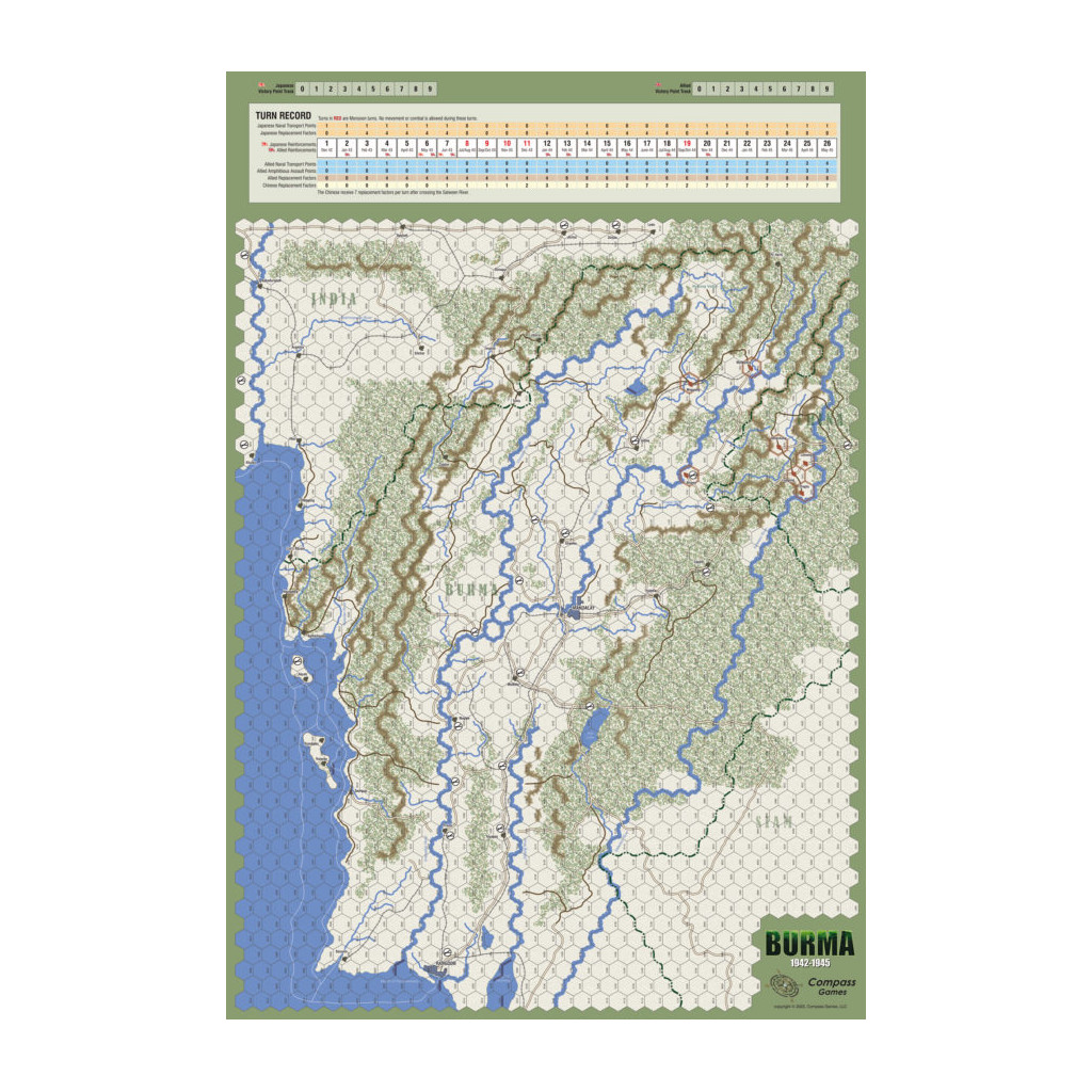 Burma, 1942-45 est une réédition du jeu original conçu par Game Designers Workshop en 1976. Ce jeu à l'échelle opérationnelle, mettant en scène des brigades et des bataillons, progresse par à-coups, car les ravitaillements et la mousson peuvent limiter les opérations. Le terrain accidenté et les lignes de ravitaillement précaires en font un jeu axé sur la manœuvre et la logistique, que les joueurs doivent habilement gérer pour atteindre la victoire.