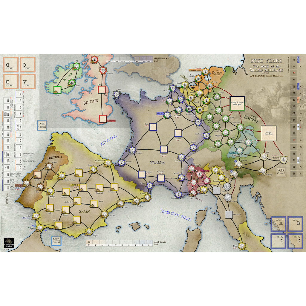 Le jeu propose également des options supplémentaires, comme des combats dans les colonies d’Amérique du Nord (où le conflit est connu sous le nom de « Guerre du Roi Guillaume »), des batailles navales dans l’Atlantique, ainsi que des règles spéciales pour envahir l’Angleterre et l’Irlande. Les points de victoire sont toujours gagnés ou perdus par le joueur de l’Alliance, mais de nouvelles mécaniques influencent les négociations de paix, en fonction de la situation sur les plateaux en Espagne, Allemagne, Irlande et Angleterre.