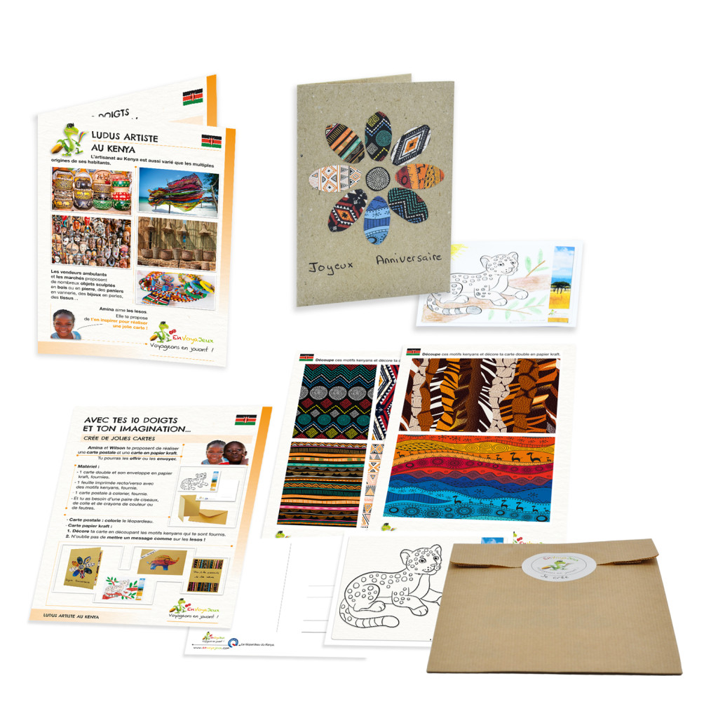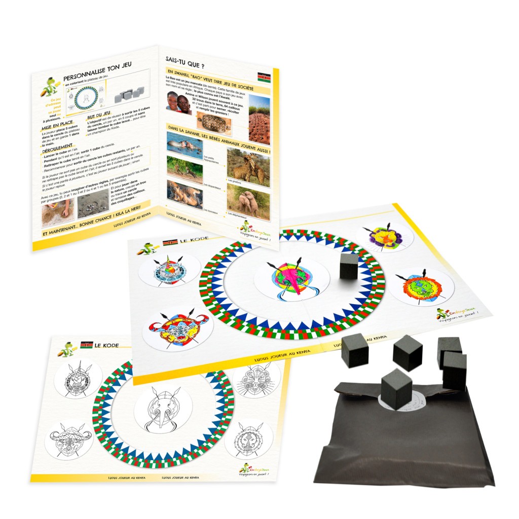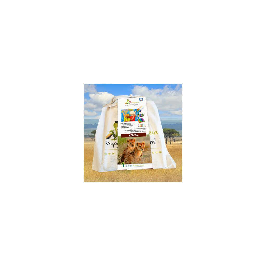 Le pochon Voyageons en jouant Kenya contient de multiples activités ludiques et éducatives pour un "VoyaJeux" insolite :