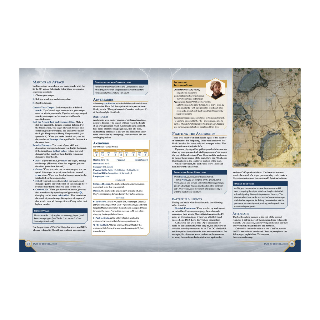 Cette aventure contient les règles de base nécessaires pour jouer, mais une copie du Stormlight Handbook complète l’expérience. The First Step peut également servir de prologue à l’aventure Stonewalkers.