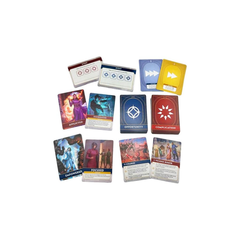 Augmentez les enjeux ! Dans le jeu de rôle Cosmere, chaque test de compétence peut orienter l’intrigue vers de nouvelles directions passionnantes. Chaque carte Opportunité ou Complication offre des options mécaniques et narratives pour les scènes de combat, de conversation et d’entreprise. Ce set comprend également des cartes pour suivre l’Initiative, les Événements et les Conditions courantes.