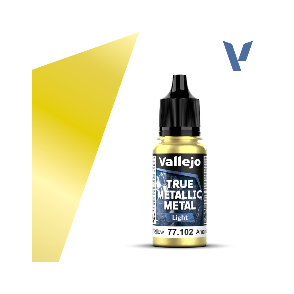 Vallejo - TMM : Radiant Yellow (Light) est une des couleurs conçues pour rehausser les teintes de base. Il s'agit de versions plus claires et plus lumineuses des 20 couleurs de base, qui peuvent être mélangées dans différentes proportions pour obtenir des nuances intermédiaires.