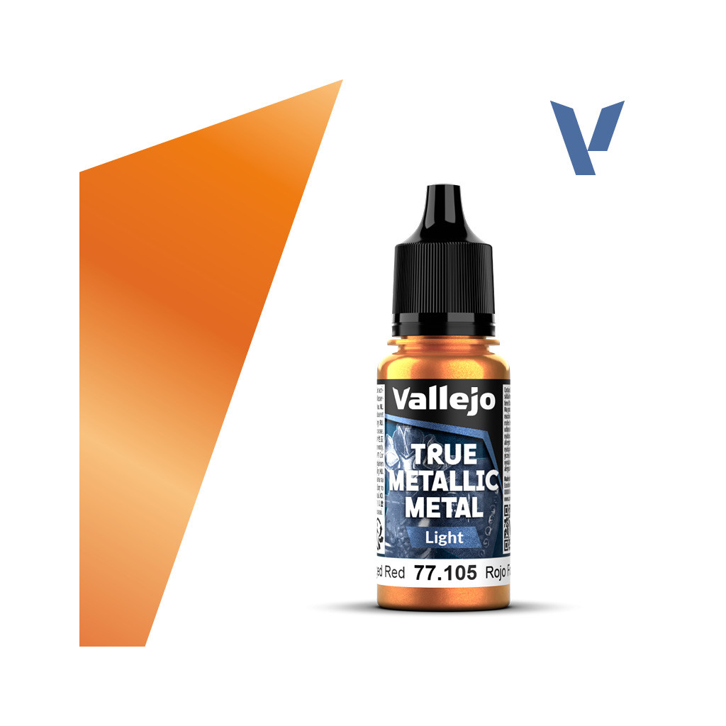 Vallejo - TMM : Forged Red (Light) est une des couleurs conçues pour rehausser les teintes de base. Il s'agit de versions plus claires et plus lumineuses des 20 couleurs de base, qui peuvent être mélangées dans différentes proportions pour obtenir des nuances intermédiaires.