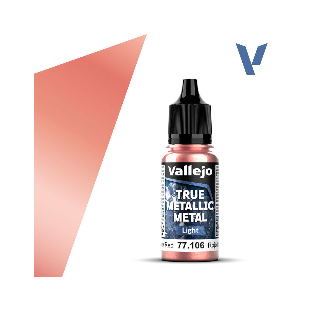 Vallejo - TMM : Ruby Red (Light) est une des couleurs conçues pour rehausser les teintes de base. Il s'agit de versions plus claires et plus lumineuses des 20 couleurs de base, qui peuvent être mélangées dans différentes proportions pour obtenir des nuances intermédiaires.