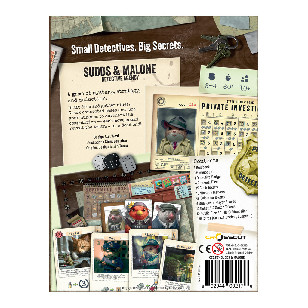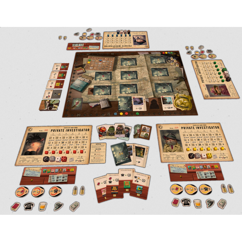 À votre tour, piochez un dé dans la réserve et choisissez votre action. Améliorez vos compétences avec « Office », interrogez des suspects avec « Calendar », fouillez la ville à la recherche d'indices, utilisez « Flimflam » pour distraire le chat ou obtenir des indices supplémentaires, plongez-vous dans de nouvelles affaires, faites le plein de balles, ou contentez-vous de vous détendre en lisant le journal pour trouver des indices supplémentaires.