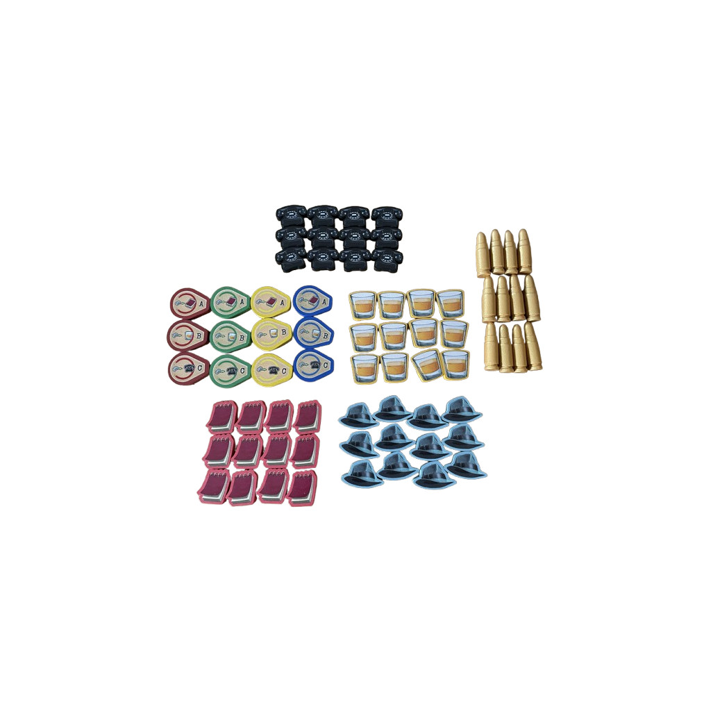 Obtenez les composants de luxe de Sudds & Malone : 48 jetons « preuves » en bois (finition par transfert thermique), 12 jetons « informateur » en bois (4 par couleur de joueur) et 12 balles en bois.