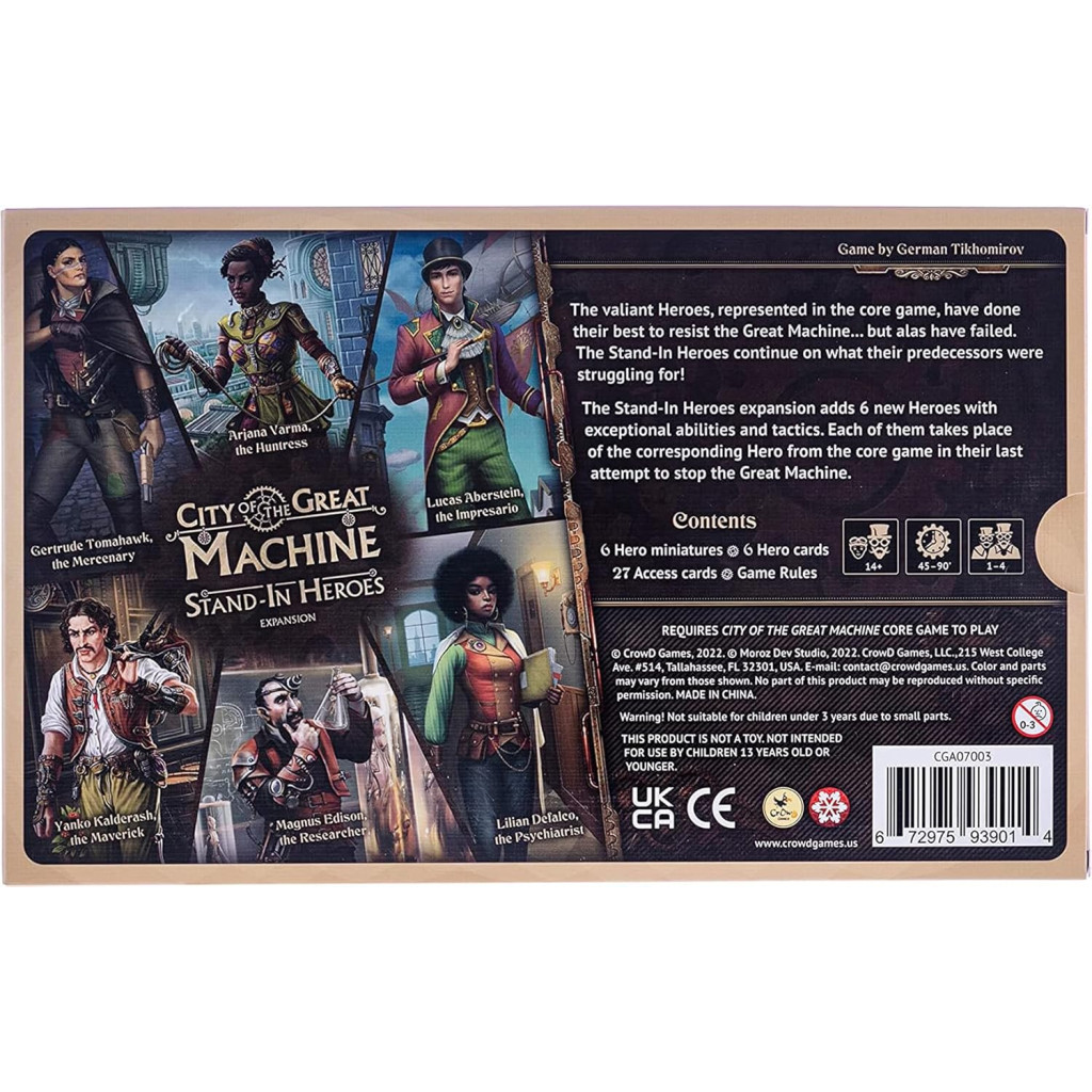City of the Great Machine Stand-In Heroes ajoute 6 nouveaux héros dotés de capacités et de tactiques exceptionnelles. Chacun d'entre eux remplace le héros correspondant du jeu de base dans leur dernière tentative pour arrêter la Grande Machine.