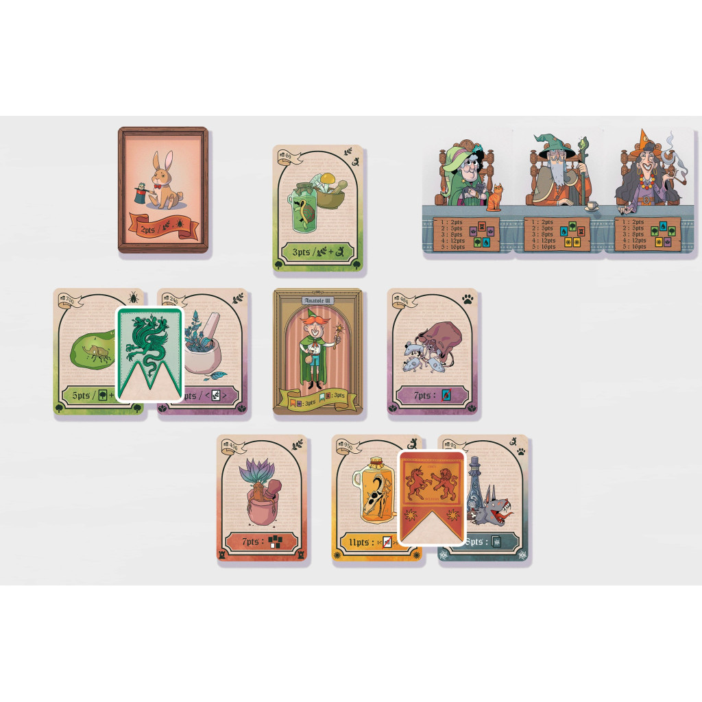 - 113 cartes 63×88 (10 sorciers, 10 juges, 13 familiers, 8 chapitres de 10 cartes chacun)
