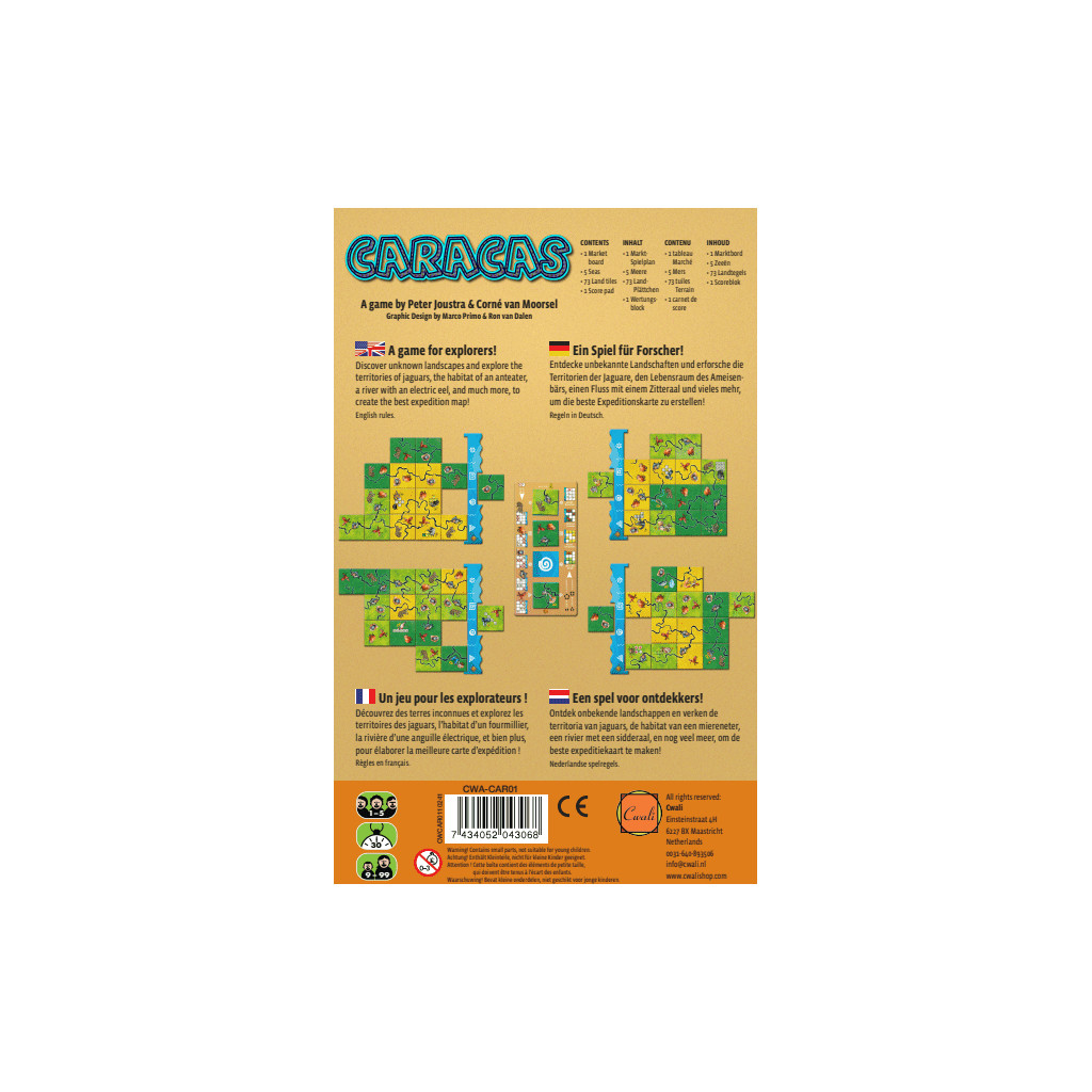 L'objectif de Caracas est de créer la carte d'expédition la plus précieuse en plaçant stratégiquement des tuiles terrestres et en découvrant des zones uniques telles que des territoires de jaguars, des habitats de fourmiliers et des rivières avec des anguilles électriques.