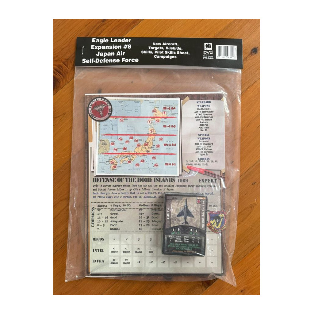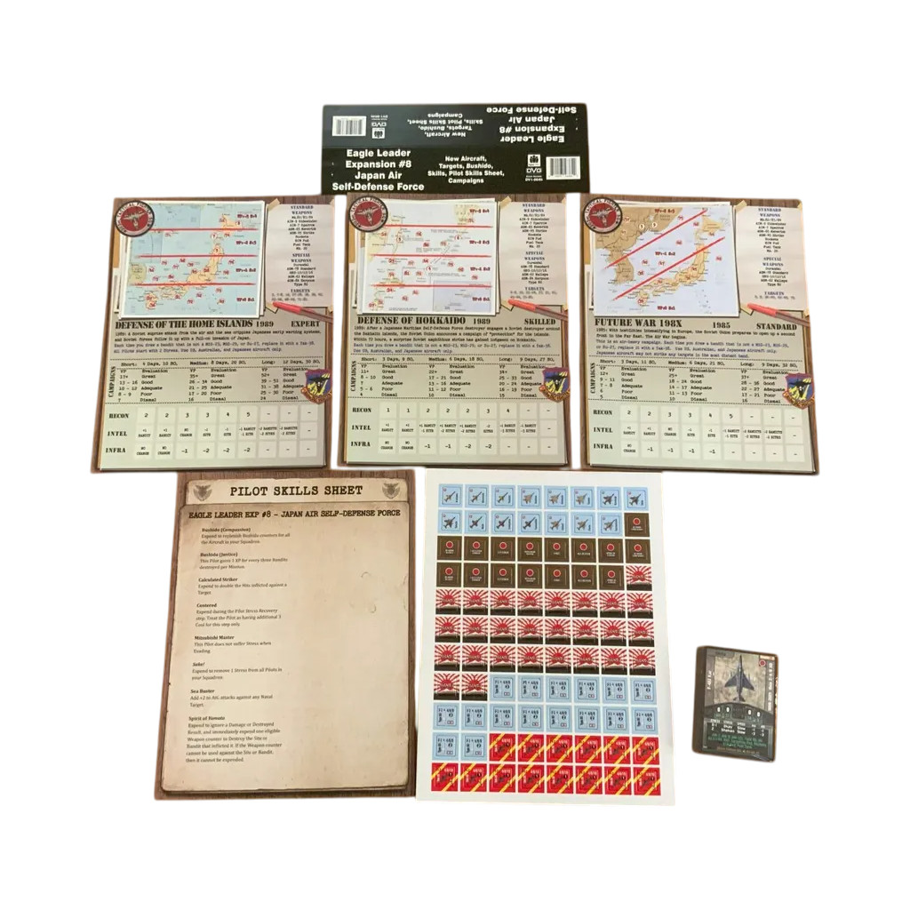 L’Est est rouge dans cette extension mettant en vedette les avions de la Japan Air Self-Defense Force ! Avec des avions tels que le F-4EJ, le F-104J et le F-15J, ce set ouvre un tout nouveau front dans le théâtre du Pacifique ! Ce set ajoute 56 cartes et 88 pions à votre jeu Eagle Leader, comprenant :