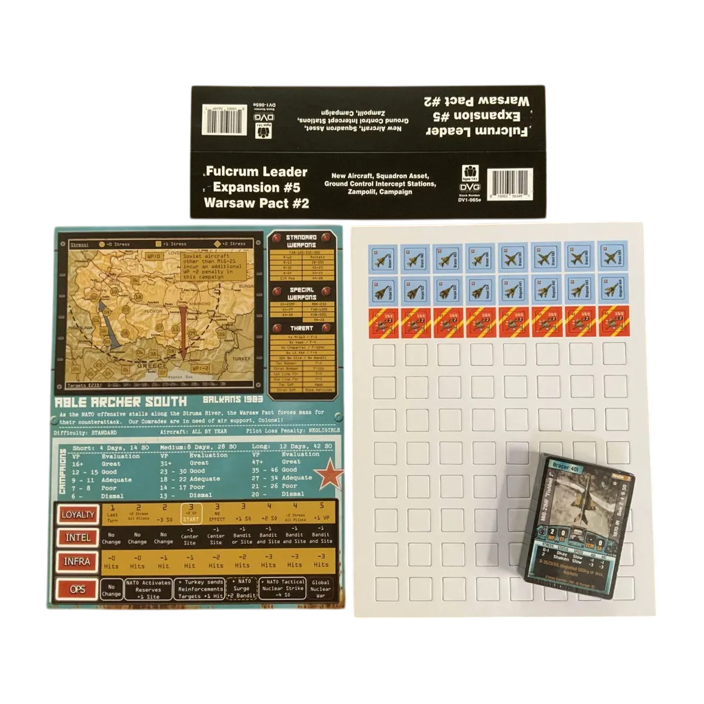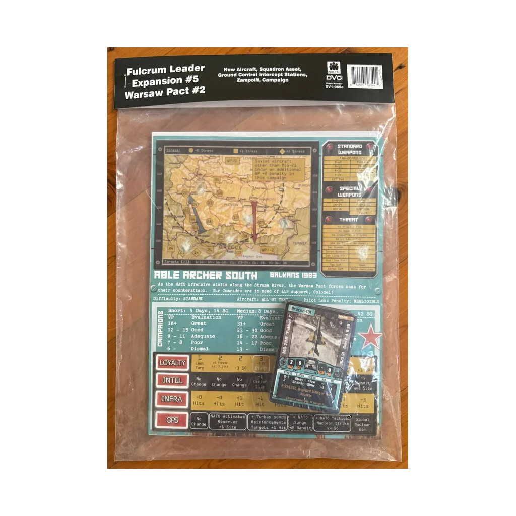 Au sein du Pacte de Varsovie, les avions soviétiques ont été largement utilisés sous forme de variantes propres à chaque nation. Cet ensemble met en avant les forces du Groupe Sud du Pacte de Varsovie, comprenant des avions hongrois, bulgares et roumains. Il ajoute 56 cartes et 16 pions à votre jeu Fulcrum Leader.