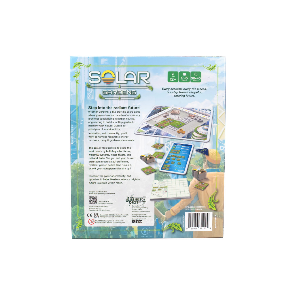 Solar Gardens est un jeu léger et convivial basé sur le draft de tuiles, où chaque joueur incarne un architecte visionnaire spécialisé dans l’ingénierie carbone neutre, chargé de créer un jardin sur le toit en harmonie avec la nature. Guidés par les principes de durabilité, d’innovation, de communauté et de stratégie, les joueurs doivent exploiter les énergies renouvelables pour aménager des jardins paisibles et fonctionnels.