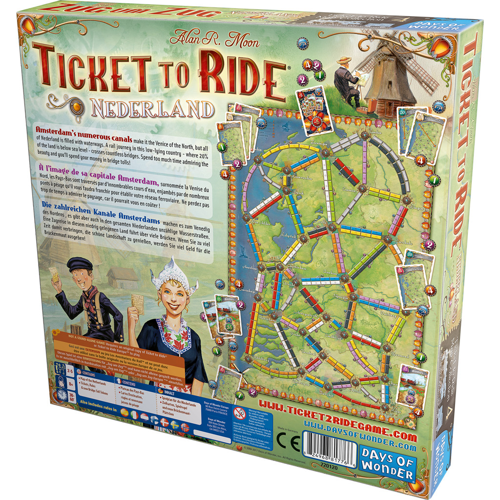 Dans cette nouvelle extension de la série des Aventuriers du Rail, le paysage y joue un rôle central. Les Pays-Bas, bien connus pour leurs moulins à vent, leurs tulipes et leurs fromages, ont une spécificité qui rend son paysage unique : les canaux. Cette caractéristique, aussi agréable soit-elle pour la vue, devra être prise en compte dans l'établissement de votre stratégie. Construisez un réseau ferroviaire étendu à travers ce verdoyant pays en faisant preuve d'un grand sens de la gestion. Bâtissez votre stratégie autour des lignes à fort potentiel!
