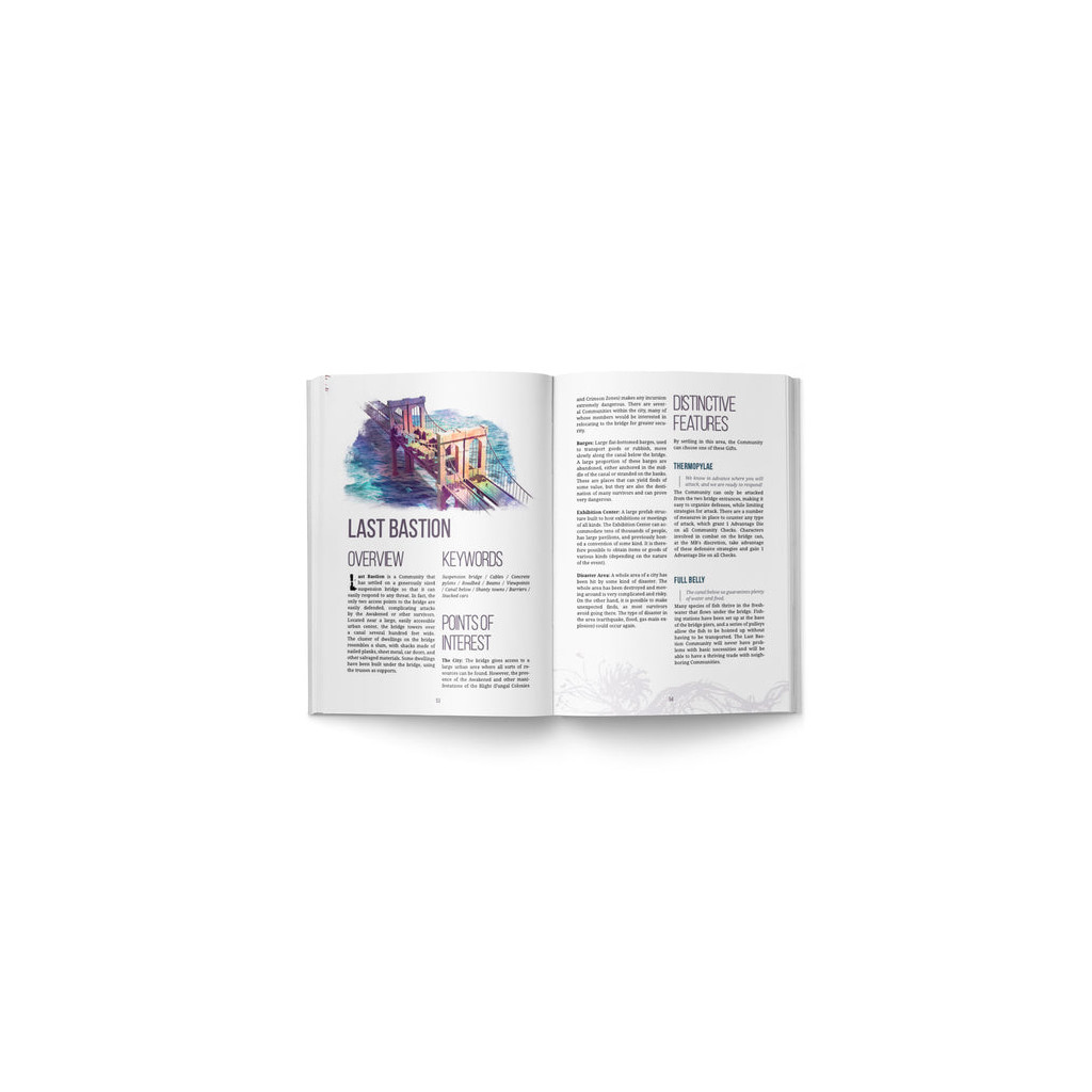 - 15 Secteurs thématiques avec des zones et dynamiques sociales préconçues, que vous pouvez utiliser pour démarrer votre partie ou intégrer à n’importe quelle campagne personnalisée.