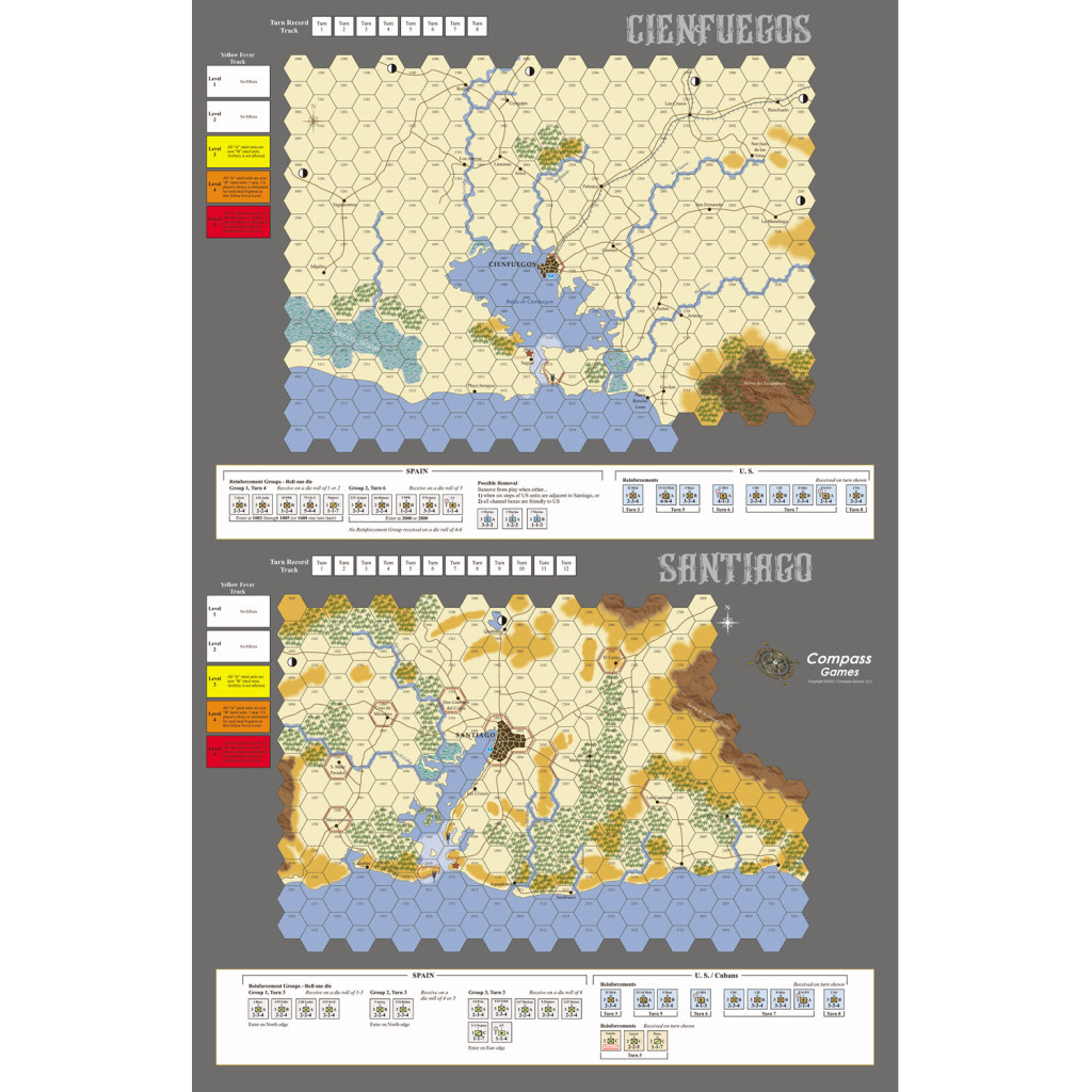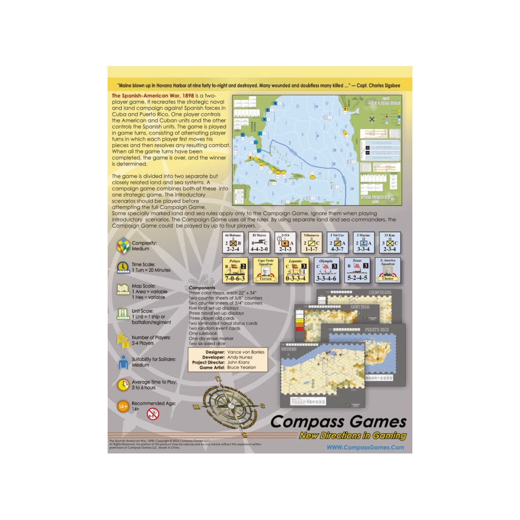 Spanish-American War, 1898 est un jeu à deux joueurs sur la guerre hispano-américaine de 1898, conçu par Vance von Borries. Il recrée la campagne stratégique navale et terrestre contre les forces espagnoles à Cuba et à Porto Rico. Un joueur contrôle les unités américaines et cubaines, tandis que l'autre contrôle les unités espagnoles. La partie se déroule en tours de jeu, composés de tours de joueur alternés durant lesquels chaque joueur déplace ses pièces et résout les combats qui en résultent. Lorsque tous les tours de jeu sont terminés, la partie prend fin et le vainqueur est déterminé.
