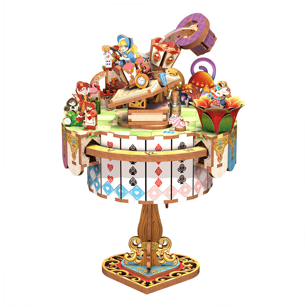 L'histoire de la visite d'Alice au salon de thé du Chapelier Fou, après être tombée accidentellement dans le mystérieux terrier du lapin, est représentée sur cette table à thé unique.