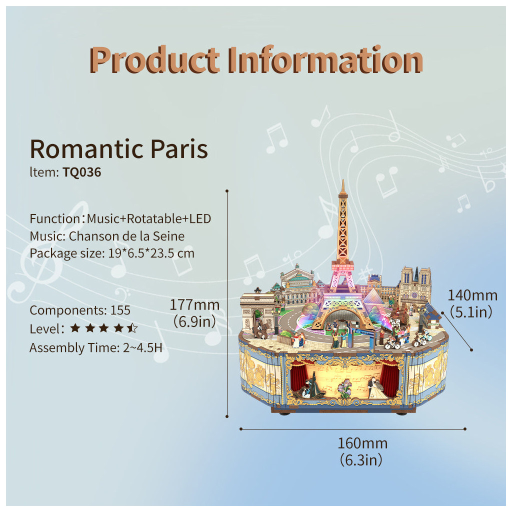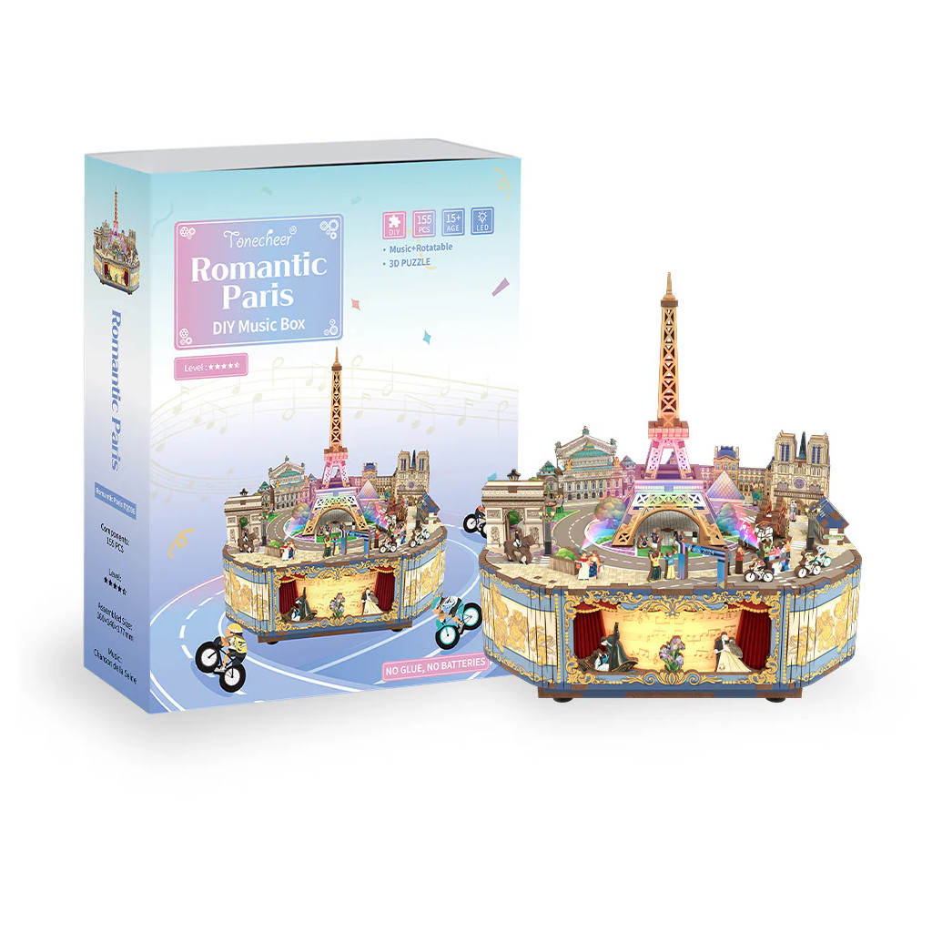 Dans cette boîte à musique à assembler, des projecteurs colorés illuminent la Tour Eiffel, des calèches nostalgiques descendent la rue, et les gens se rassemblent avec enthousiasme pour célébrer les prochains Jeux Olympiques de Paris.