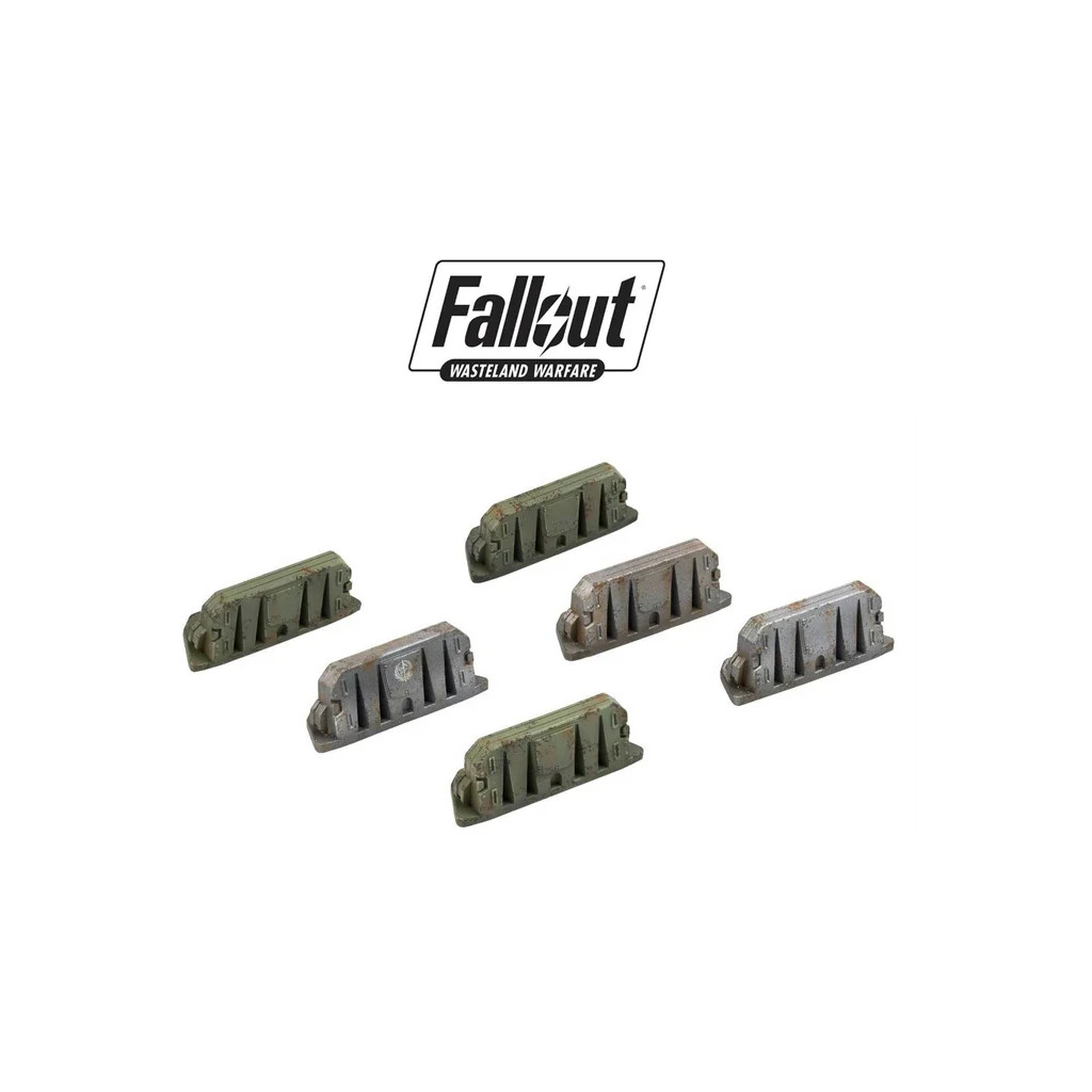 Ce coffret contient six barricades militaires en résine non peintes, permettant aux joueurs d'enrichir les décors de leurs tables de Fallout: Wasteland Warfare.