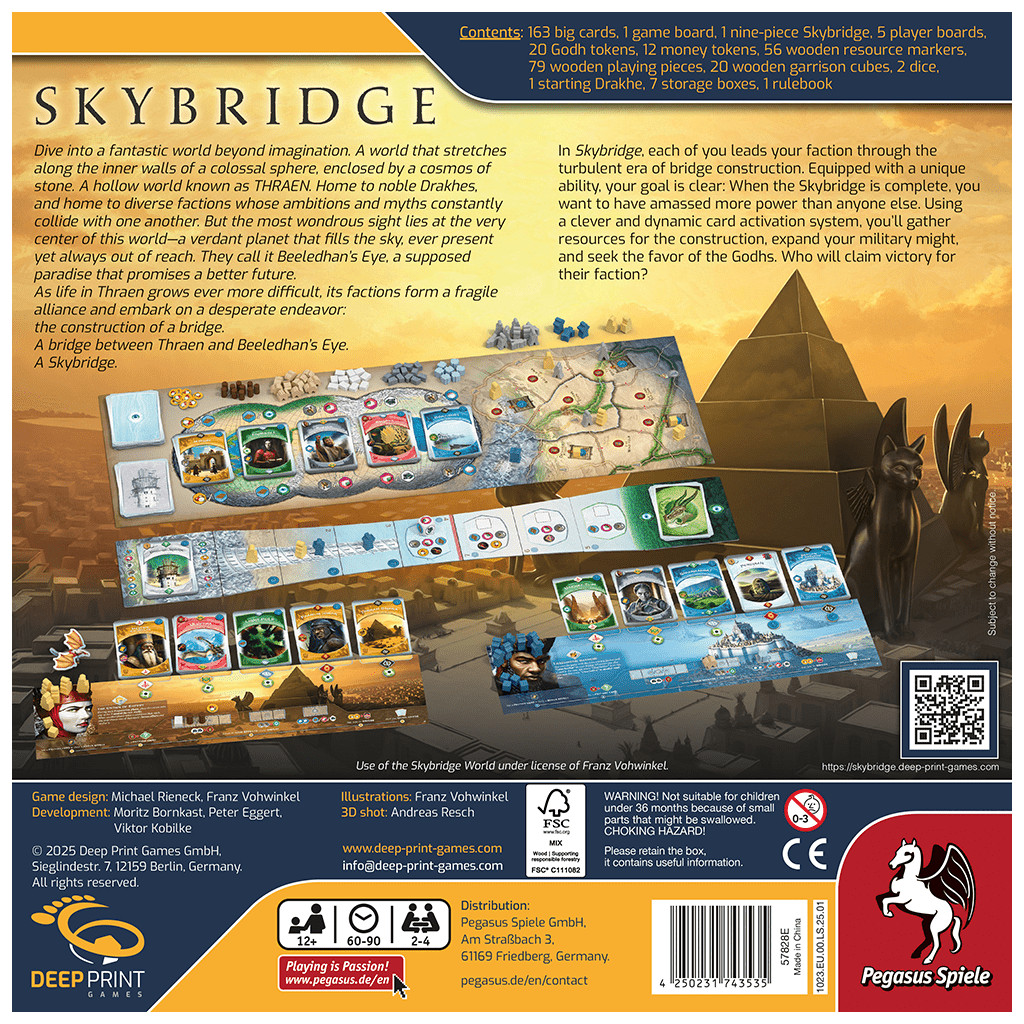 Dans Skybridge, vous guidez chacun votre peuple à travers les âges de la construction du pont. Doté d’une capacité individuelle, votre objectif est clair : une fois le pont achevé, vous devez avoir accumulé plus de pouvoir que les autres. Grâce à un mécanisme d’activation de cartes dynamique et captivant, vous collecterez les matériaux nécessaires à la construction, renforcerez votre puissance militaire et chercherez à obtenir la faveur des divinités. Quelle faction remportera la victoire pour son peuple ?