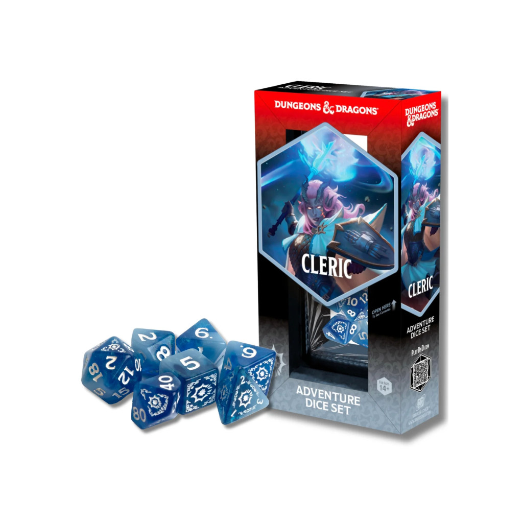 - Le set Cleric comprend 14 dés : 2 × d4 | 2 × d6 | 4 × d8 | 1 × d10 | 1 × d12 | 2 × d% | 2 × d20