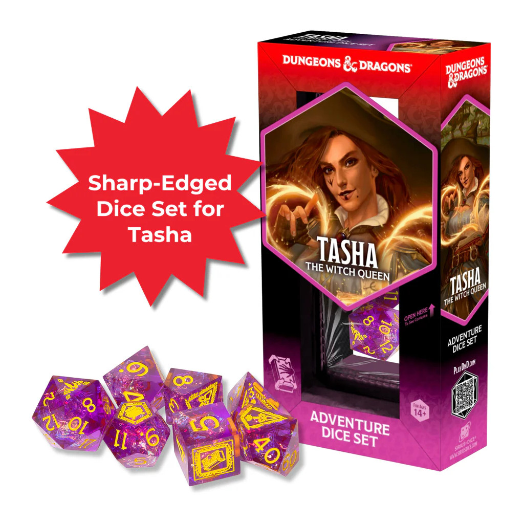 Plongez dans les ombres de la sorcellerie. Le set de dés d'aventure Tasha la Reine Sorcière canalise la ruse, le chaos et le charisme de l'une des lanceuses de sorts les plus emblématiques de D&D. Ce set de 7 dés polyédriques est parfait pour les sorciers, les envoûteurs et tous ceux qui rient en pleine incantation. Que vous lanciez le Fou Rire de Tasha ou tissiez de la magie sauvage, ces dés sont imprégnés d'attitude arcanique.