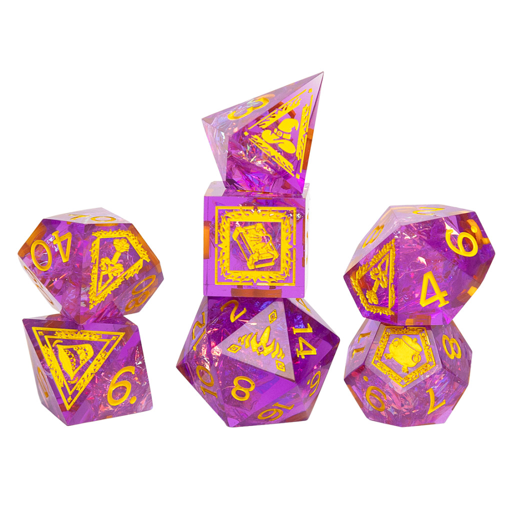 Le set Tasha comprend 7 dés : 1 x d4 (style tonneau) | 1 x d6 | 1 x d8 | 1 x d10 | 1 x d12 | 1 x d% | 1 x d20.