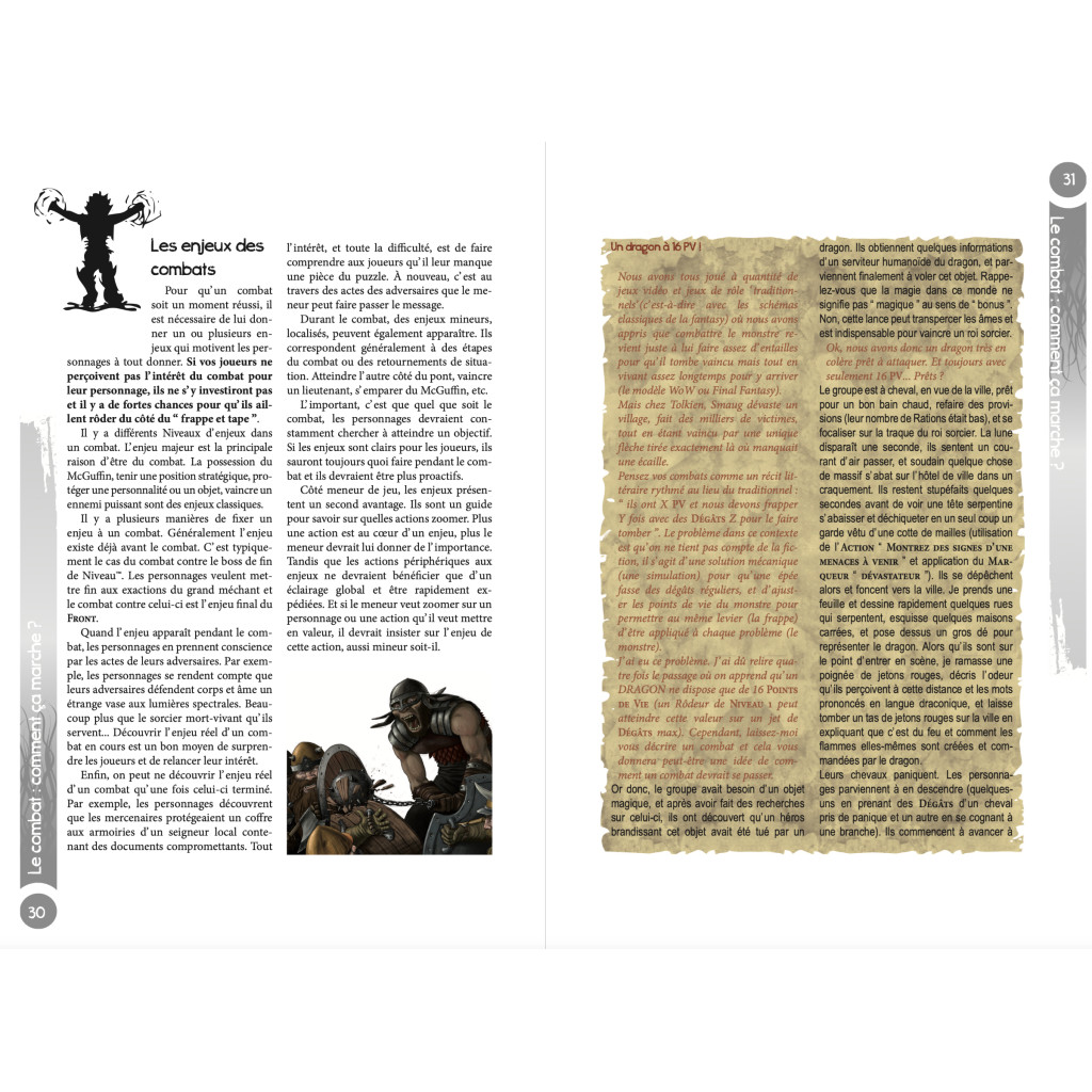 - Exemple de jeu (8 p.). Ne se contente par de raconter, mais montre également comment les règles et Principes ont été mis en place.