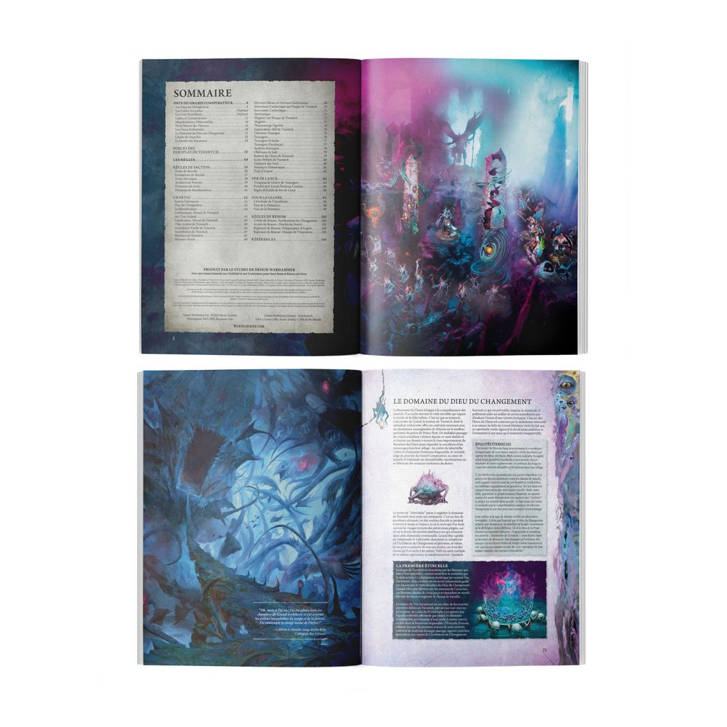 La folie règne lorsque les Disciples de Tzeentch partent en guerre. Cultistes, démons et sorciers avides de pouvoir déchaînent une fournaise kaléidoscopique de magie en jubilant pour chaque âme qu'ils immolent en offrande au Dieu du Changement. Tzeentch, le plus manipulateur et habile des Dieux Sombres, se délecte de l'anarchie causée par l'Heure du Déclin, le grand assaut du Chaos qui a plongé les royaumes dans la confusion. Habilement cachés parmi les populations des cités et des bastions, ses adeptes préparent un soulèvement qui fendra les cieux et distordra la terre pour libérer un pandémonium et refaçonner la réalité selon les caprices déments de Tzeentch.