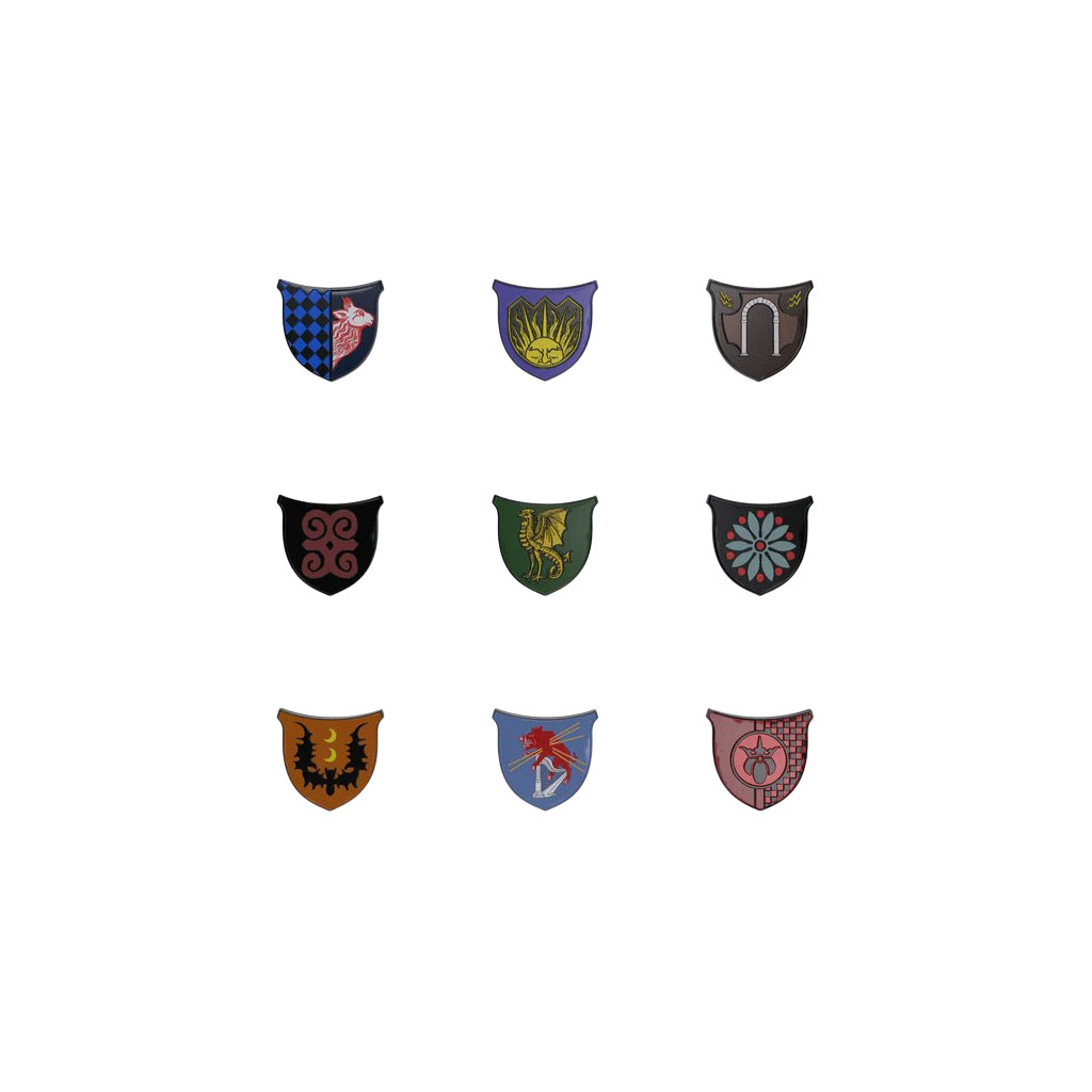 Jurez allégeance aux nobles maisons de Dolmenwood avec ce set de neuf pins en émail aux blasons des maisons !