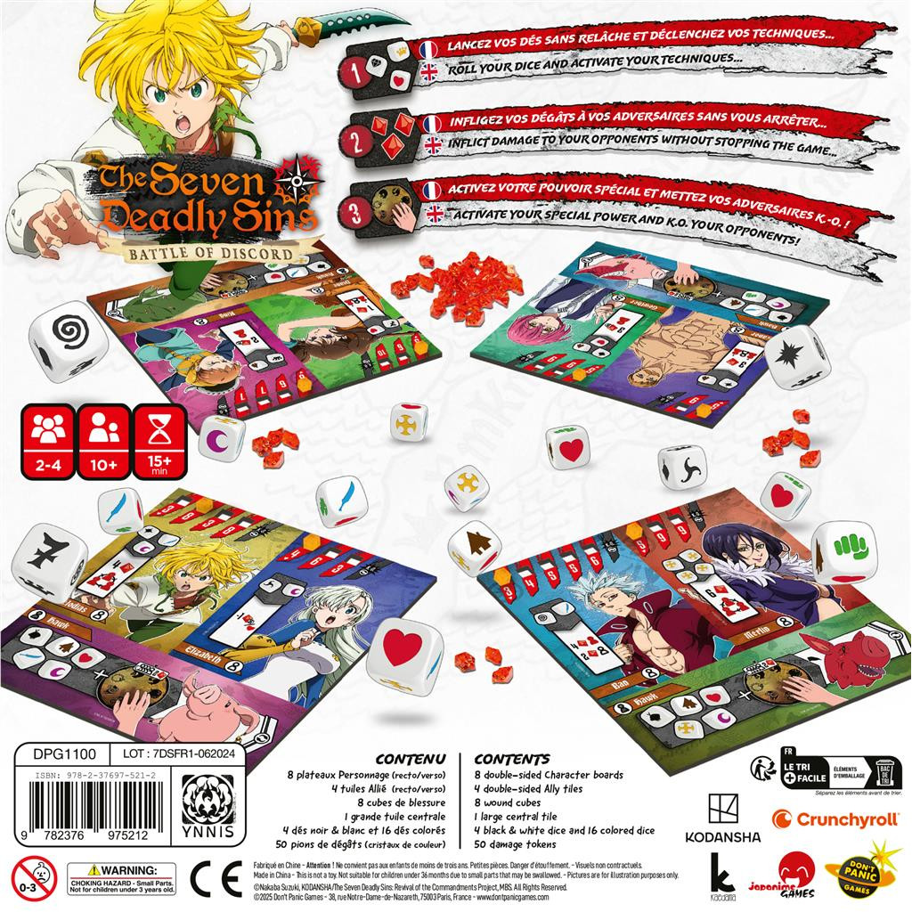 The Seven Deadly Sins : Battle of Discord est un jeu de dés asymétrique qui s'inspire du célèbre Shōnen manga éponyme. Tout le monde joue en même temps et lance ses dés pour obtenir des combinaisons qui déclenchent ses pouvoirs. Soyez le dernier héros encore debout pour l’emporter dans ce jeu à jouer en famille ou entre amis.