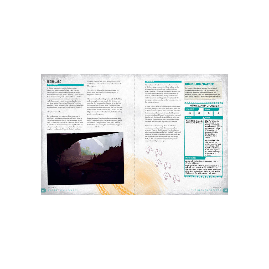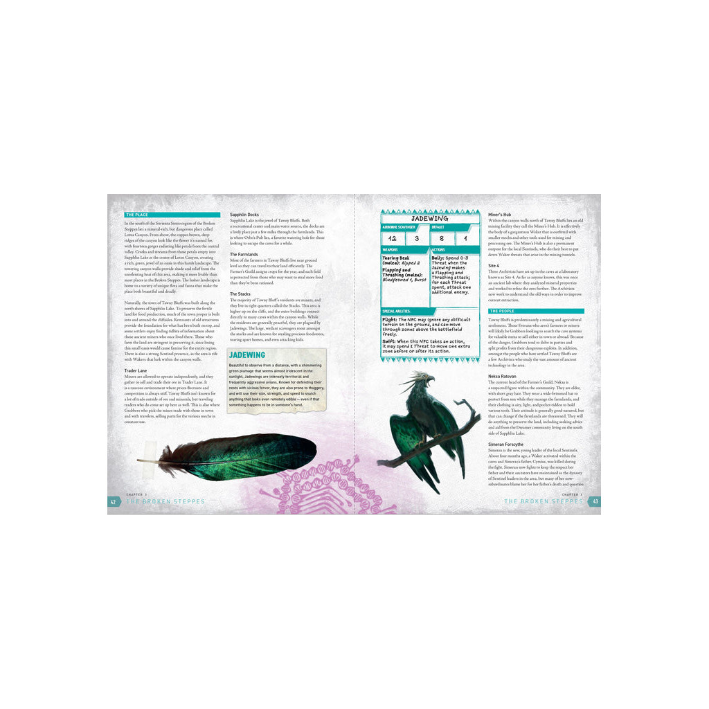Pourtant, certains appellent les Steppes Brisées leur foyer. Des Lanciers de Highguard chevauchant leurs Flat Tops, aux entreprenants habitants de Lotus Canyon, en passant par les citoyens de Trench City et les Conduits vivant aux côtés de prédateurs redoutables, les peuples de Surienta Simio ont su non seulement survivre, mais aussi prospérer au milieu des pics tranchants et des déserts implacables.