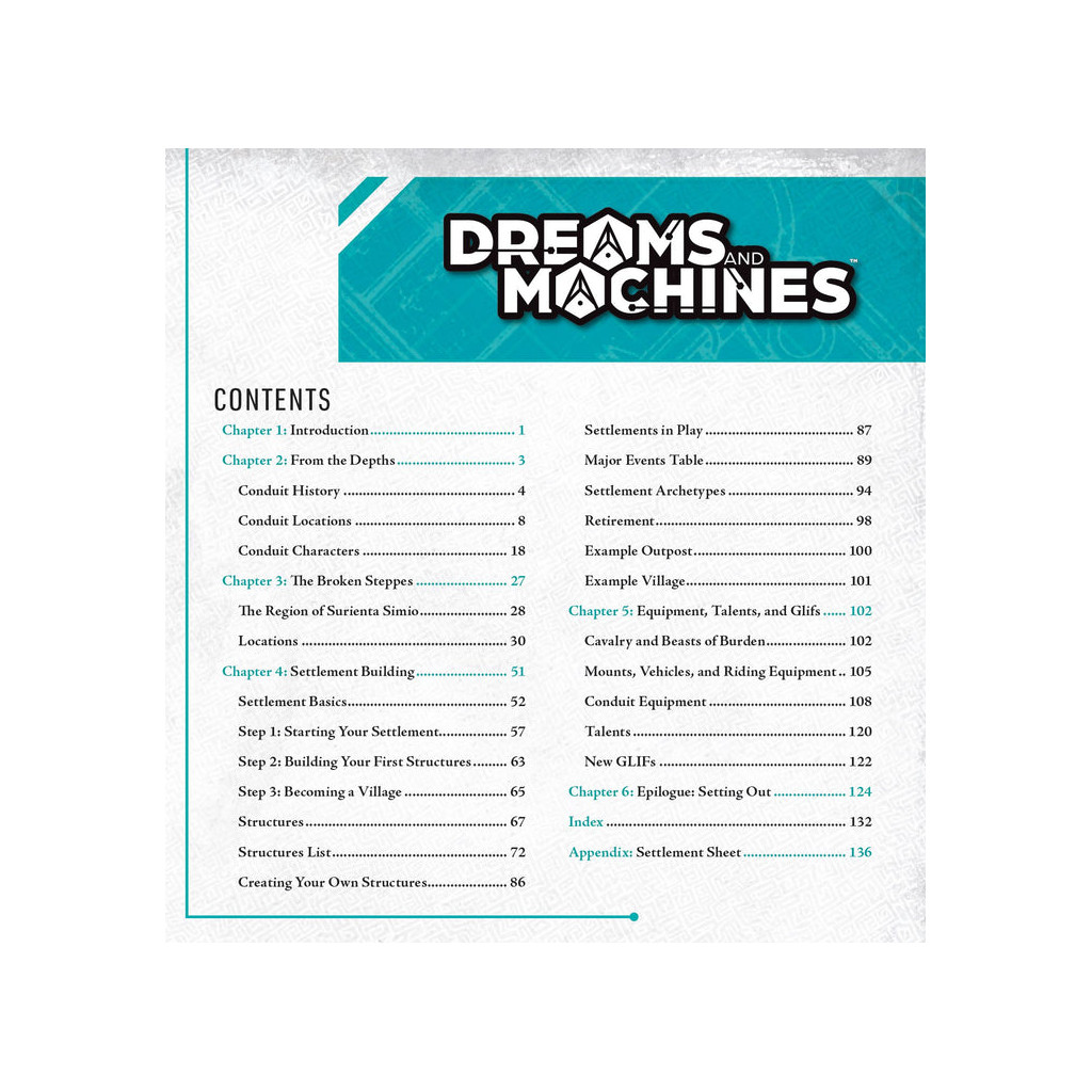 - Une présentation complète de la région de Surienta Simio, avec des guides détaillés permettant d’intégrer facilement ces lieux à vos campagnes Dreams and Machines existantes.
