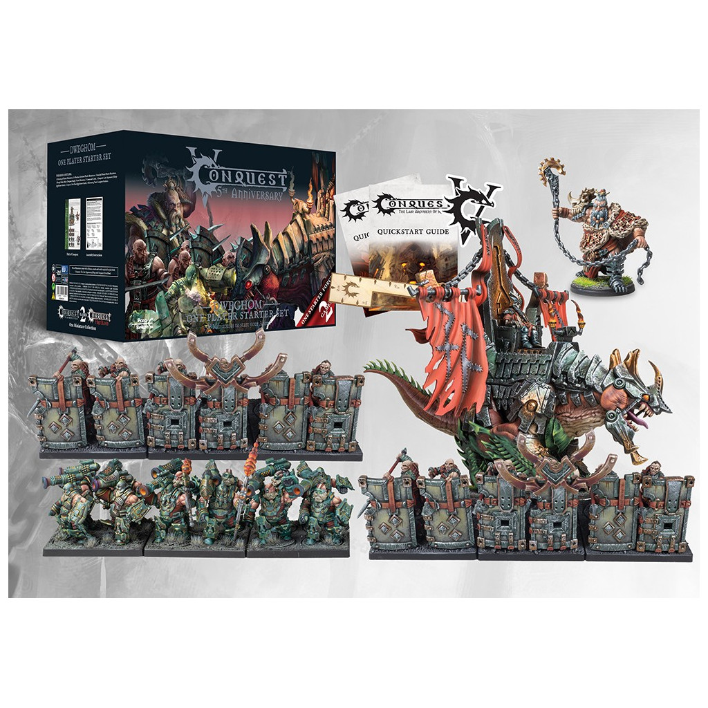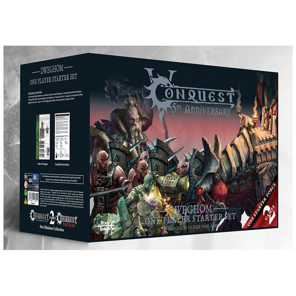 Ce set Dweghom est chargé d'un stand complet de Fireforged, de 2 stands d'Initiates Ironclad Drake et de son Hold Raegh Rider.  Chaque set de départ permet d'avoir une armée First Blood bien construite ainsi qu'un set de départ idéal pour jouer une partie de Last Argument of Kings. Ce set comprend des guides de démarrage rapide pour First Blood II et TLAOK II, ainsi que toutes les instructions d'assemblage, un excellent guide du chemin de la conquête, un décalque et un outil de mesure du 5e anniversaire, une carte en papier EA et toutes les cartes de commandement, les bases et les socles nécessaires.