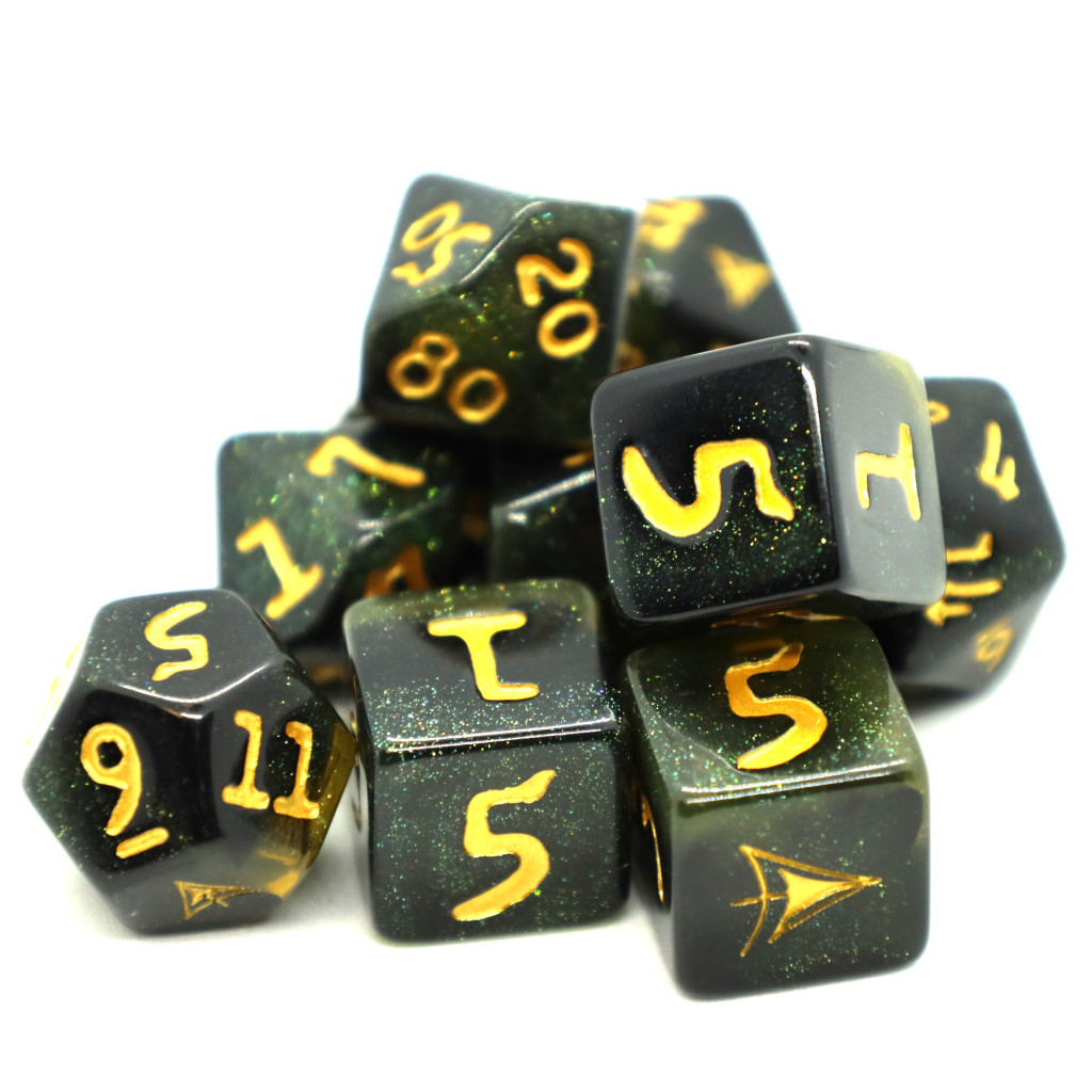Chaque jeu de dés Elder Dice contient un ensemble complet de 10 dés polyédriques :