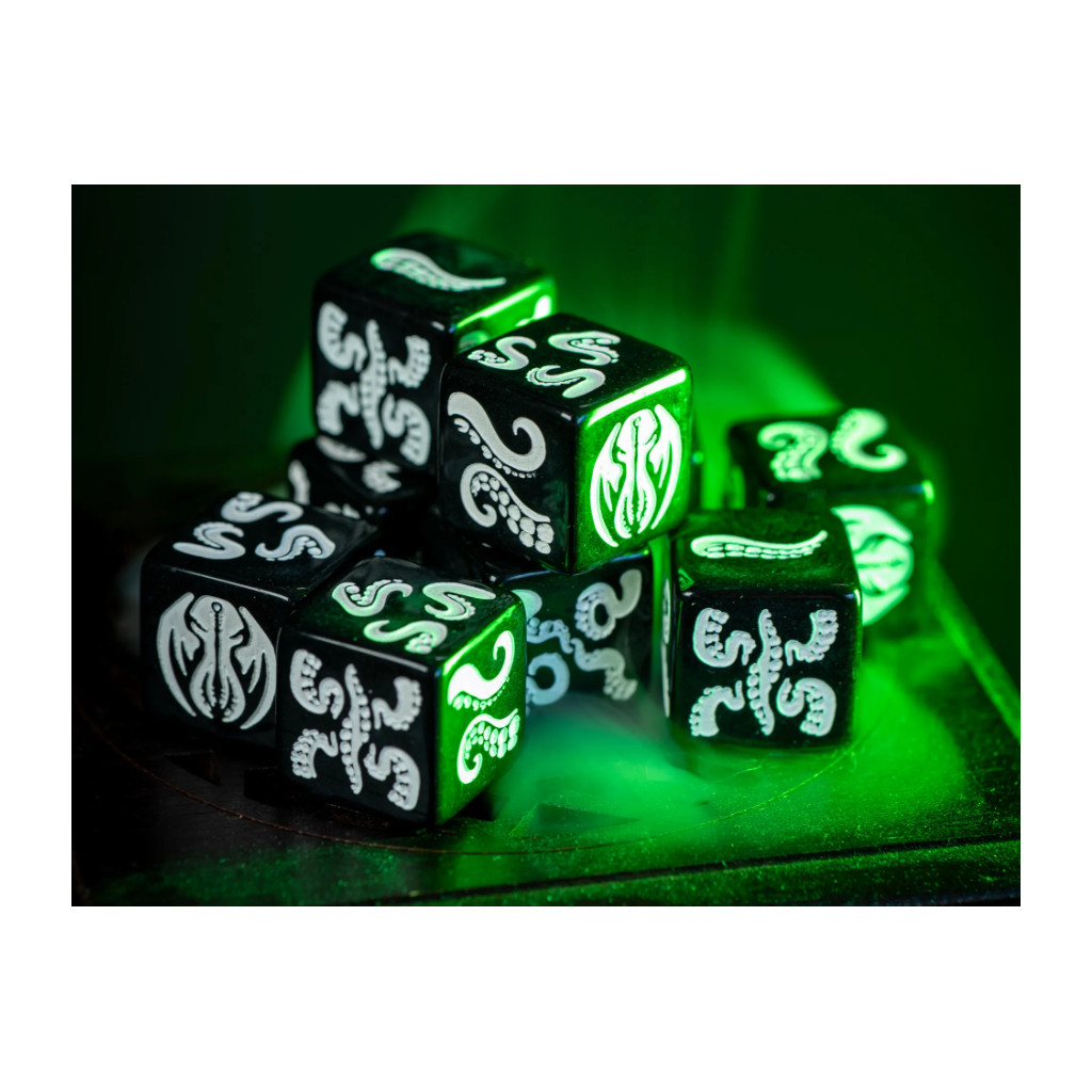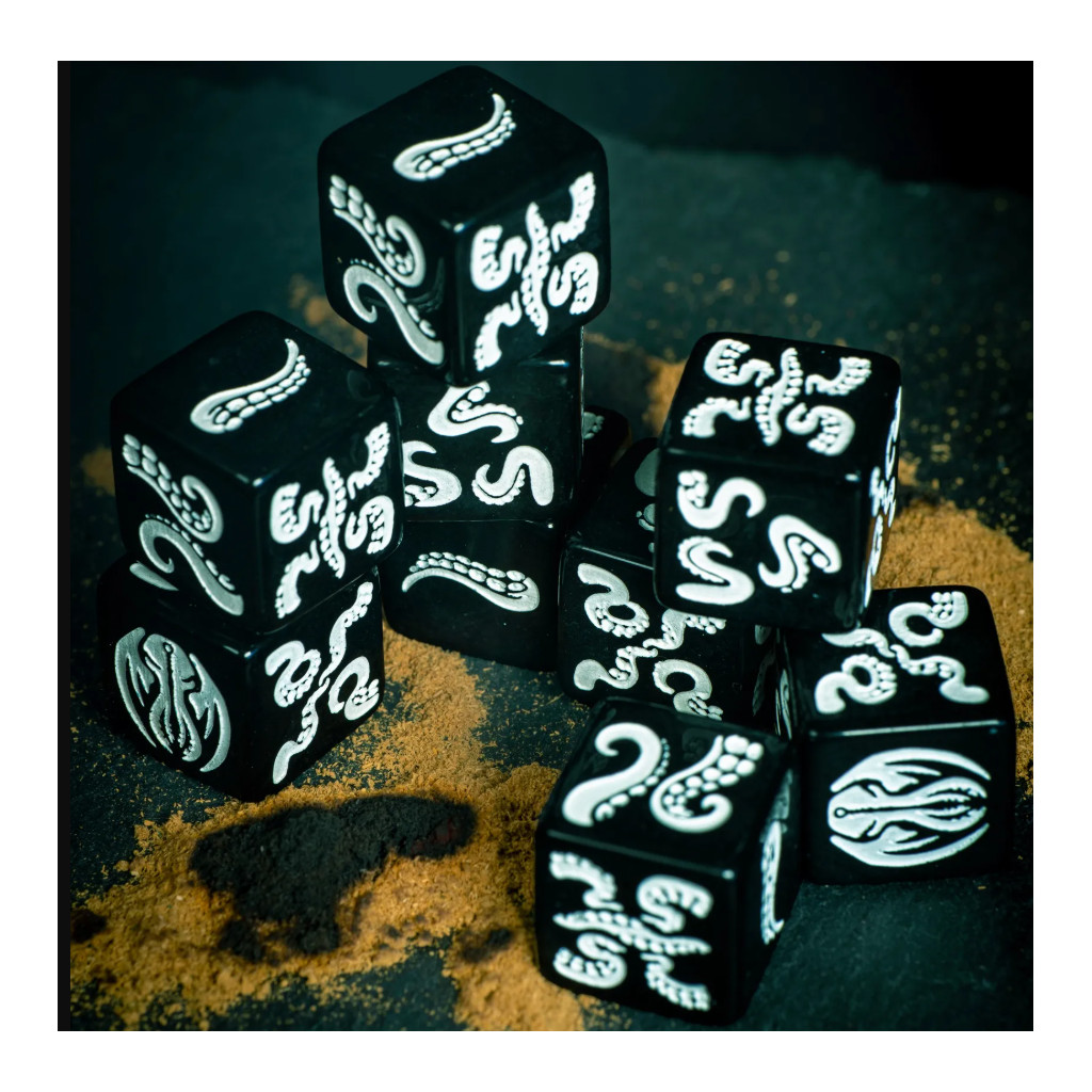Ce set exclusif comprend 9 dés à six faces (d6), chacun gravé de motifs de tentacules détaillés, parfaits pour recréer l’atmosphère lovecraftienne à votre table de jeu.