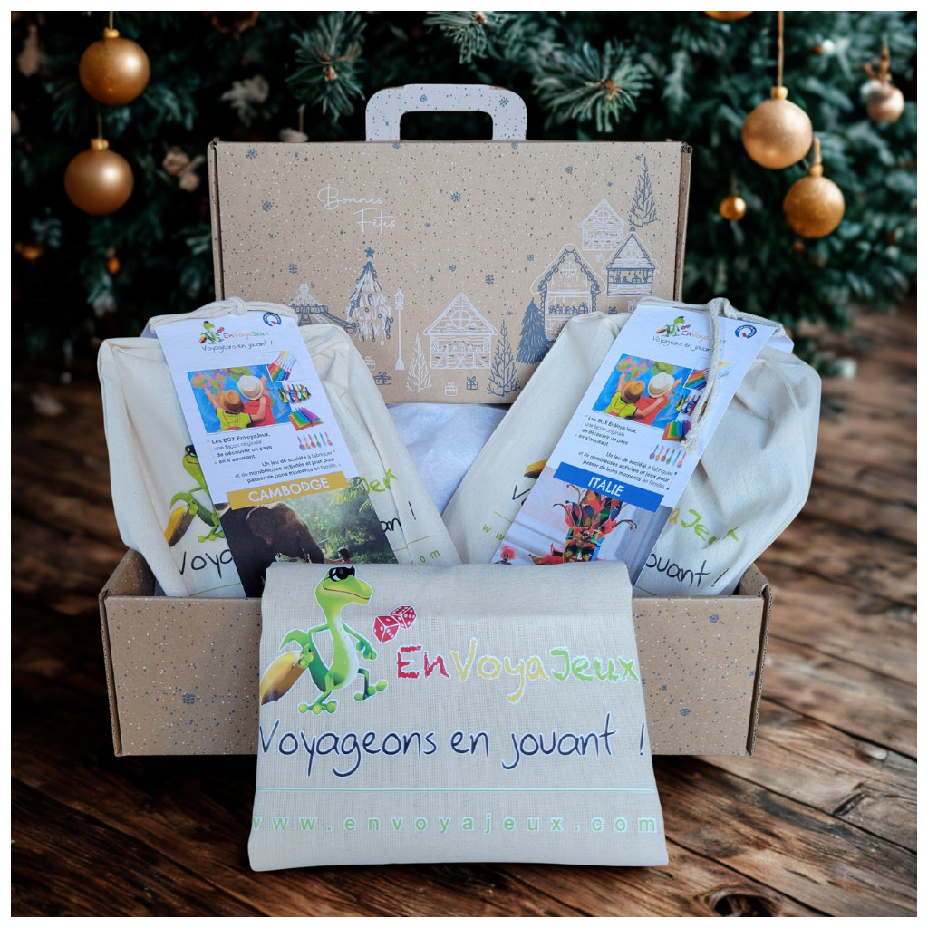 - Deux voyages en un seul coffret : « Voyageons en jouant Cambodge » et « Voyageons en jouant Italie », pour des heures de découvertes, de jeux et de complicité en famille + un joli Tote bag pour emporter les kits partout facilement !