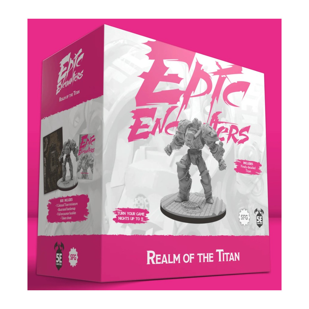 Découvrez une aventure complète, compatible avec la 5e édition, prête à être dévoilée à vos joueurs. Elle comprend une rencontre avec des statistiques complètes, des accroches scénaristiques et des conseils, une carte de combat illustrée, sans oublier l'énorme Titan (base de 120 mm !), qui ne manquera pas de provoquer quelques cris d'étonnement lorsqu'il fera son apparition sur votre table.