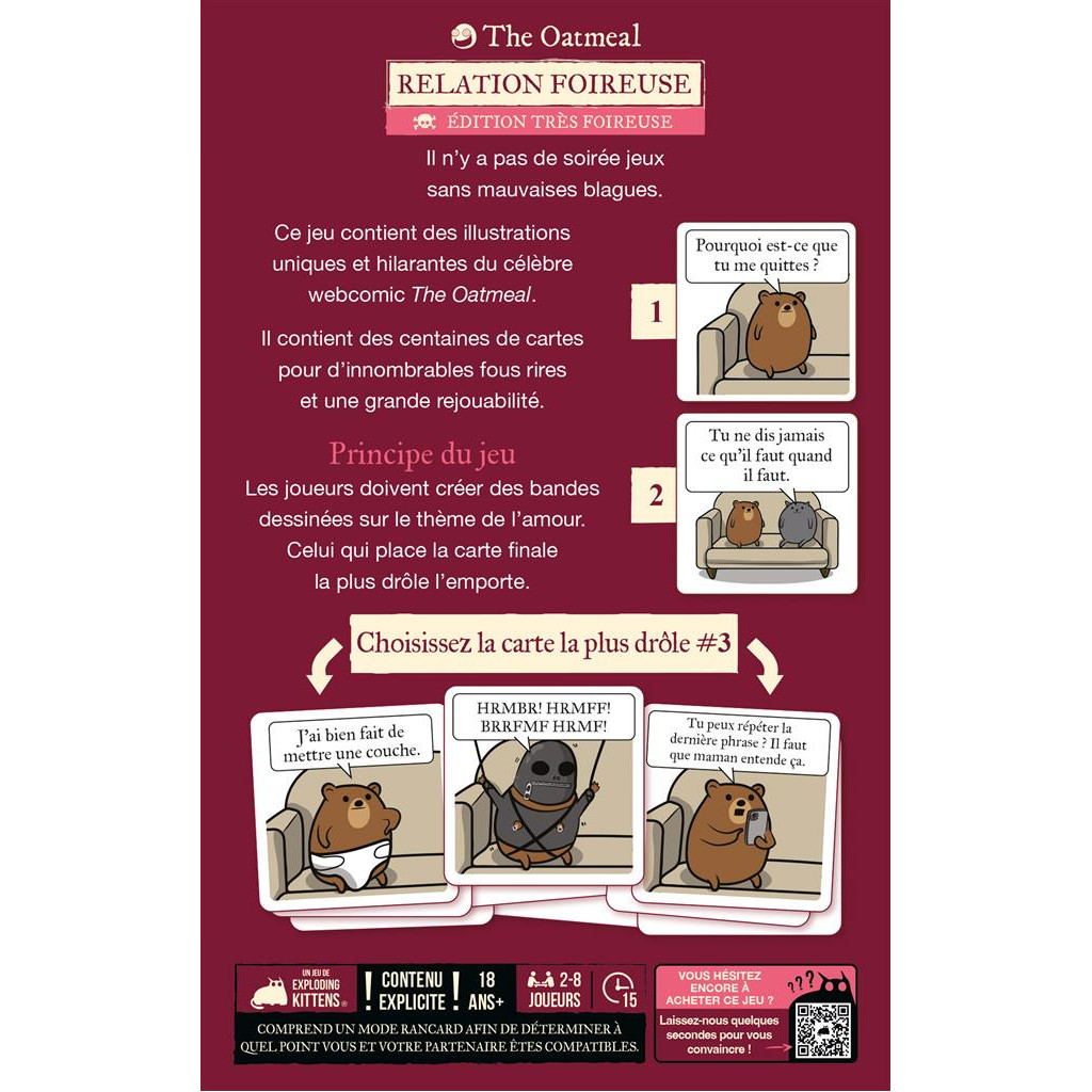 Un mode "rencard" permet aussi de jouer en duo, pour pimenter une soirée de date et tester sa compatibilité humoristique. Idéal entre amis, en couple ou pour briser la glace. Relation Foireuse - Edition Très Foireuse contient encore plus de cartes que la version classique.