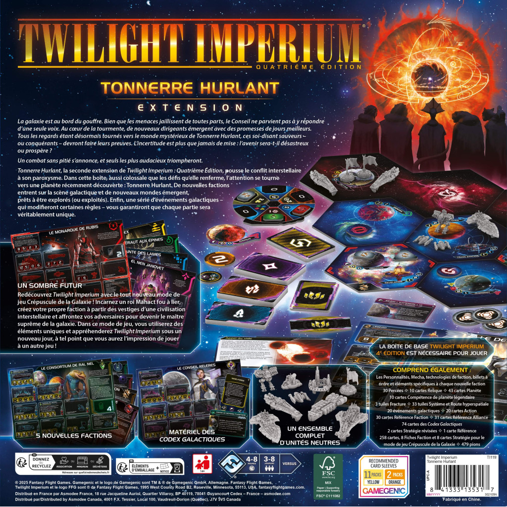 Dans cette boîte, aussi colossale que les défis qu’elle renferme, l’attention se tourne vers une planète récemment découverte : Tonnerre Hurlant. De nouvelles factions entrent sur la scène galactique et de nouveaux mondes émergent, prêts à être explorés (ou exploités). Enfin, une série d’événements galactiques - qui modifieront certaines règles -vous garantiront que chaque partie sera véritablement unique.