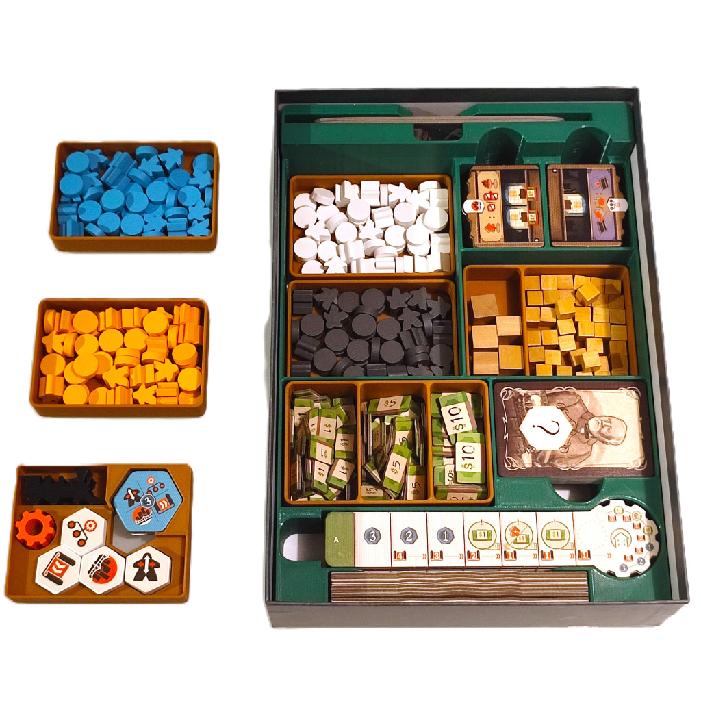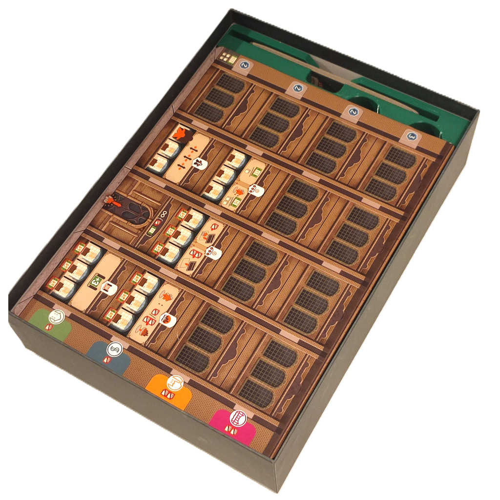 Même si les rangements sont bien faits, ils ne permettent pas de ranger les accessoires de l'extension N°1 (pourtant fournies avec le jeu de base, dans mon cas en tout cas) et ne permettent pas non plus de ranger des cartes "sleevées". Donc, inutile en ce qui me concerne.