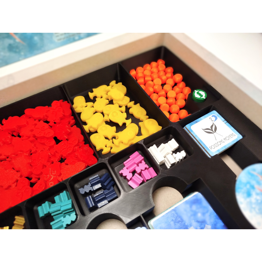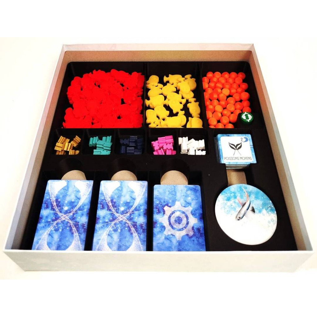 Conçu spécialement pour le jeu Finspan, cet insert optimise le rangement de toutes les pièces du jeu : tuiles, pions et cartes (avec ou sans sleeves), le tout dans une seule boîte. Chaque compartiment a été pensé pour une installation rapide et efficace.