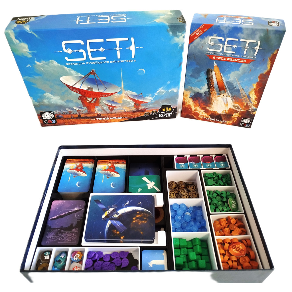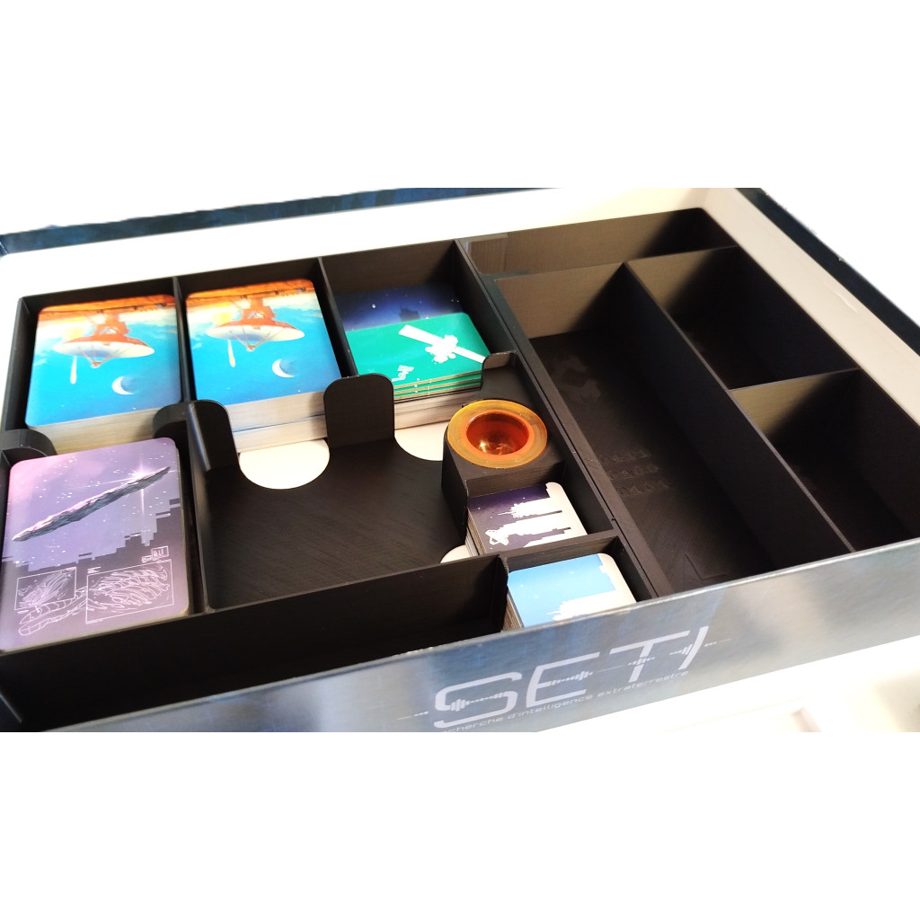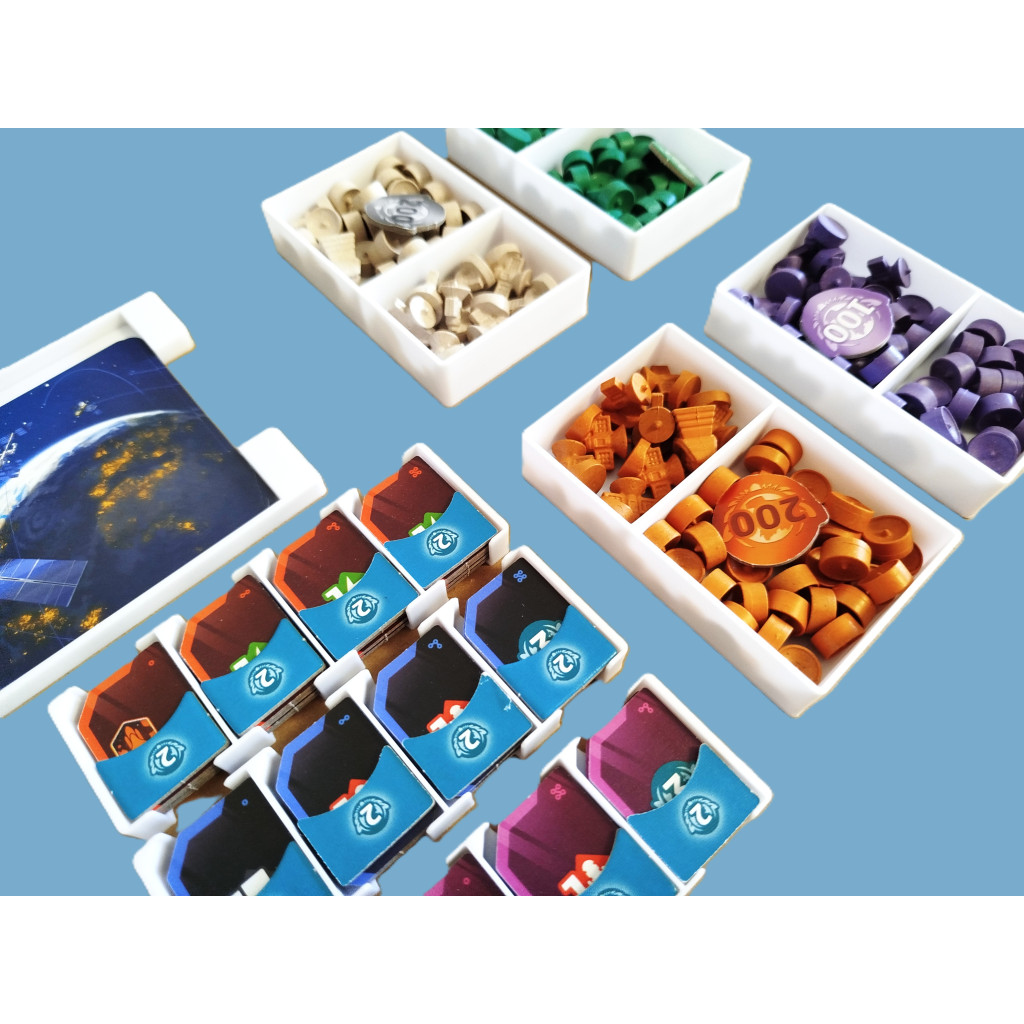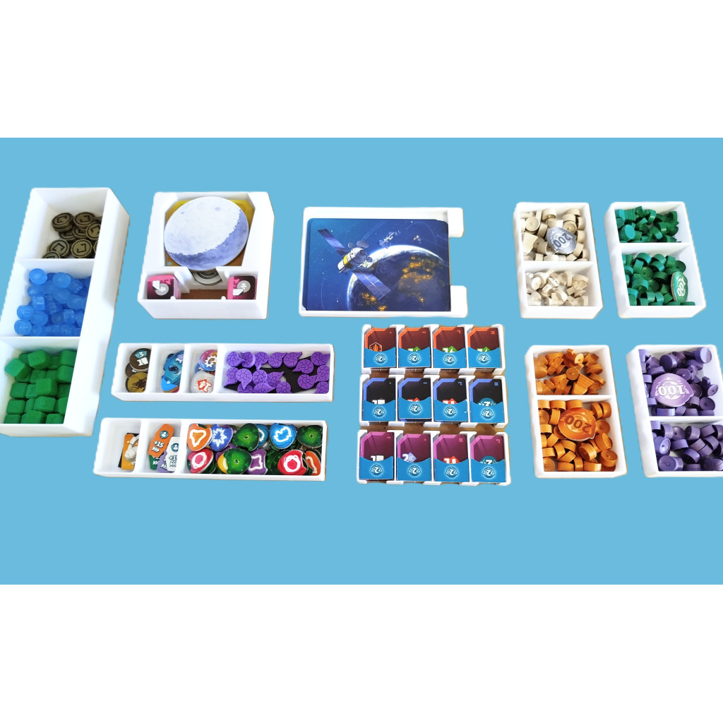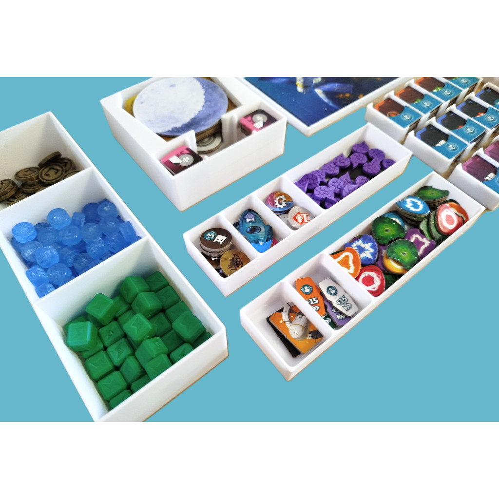 Agences spatiales, vous permet de ranger parfaitement vos tuiles, cartes (avec ou sans sleeve) et pions dans une seule boite. Les éléments qui composent l'insert ont été pensés pour une mise en place rapide du jeu.
